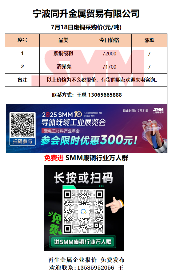 今日同升金属 废铜采购报价已更新,有货的朋友欢迎联系我们!