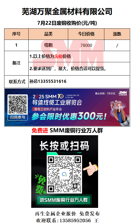 7月22日芜湖万聚金属 废铜采购报价