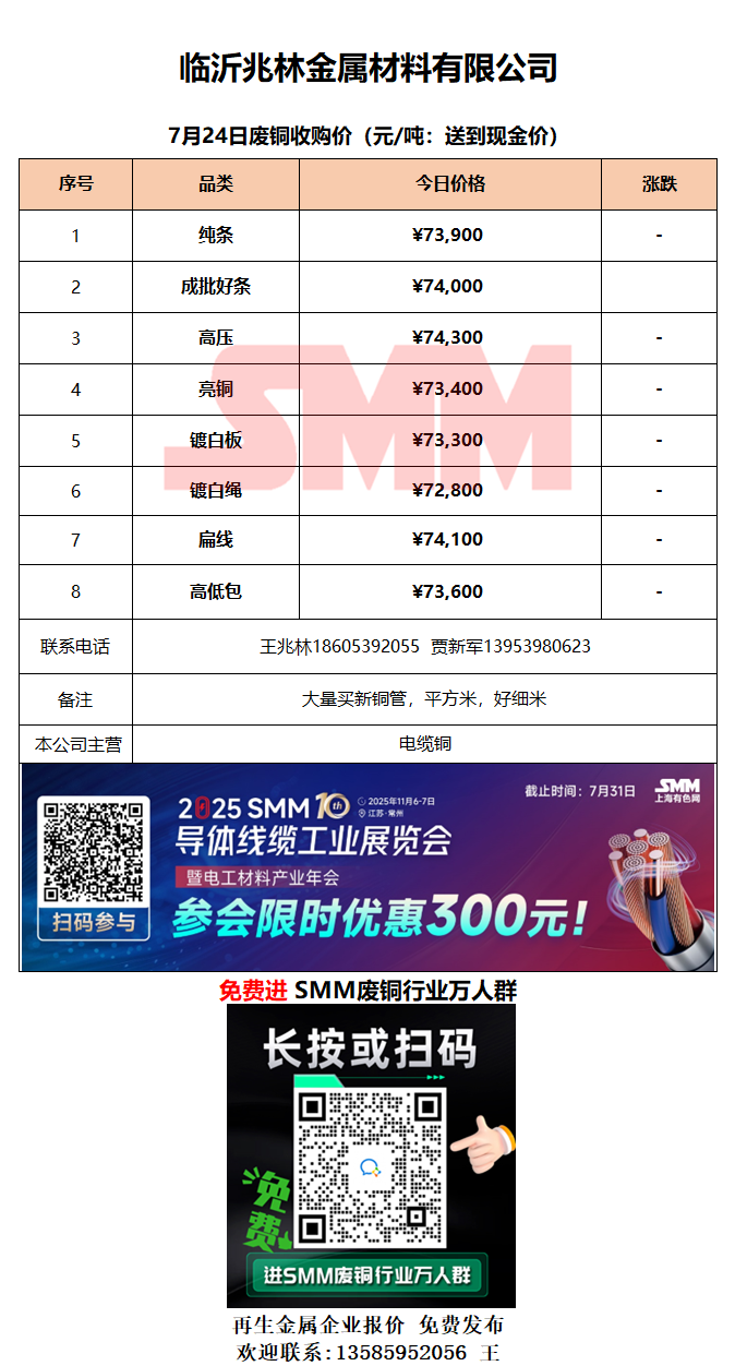 7月24日临沂兆林金属 废铜采购报价