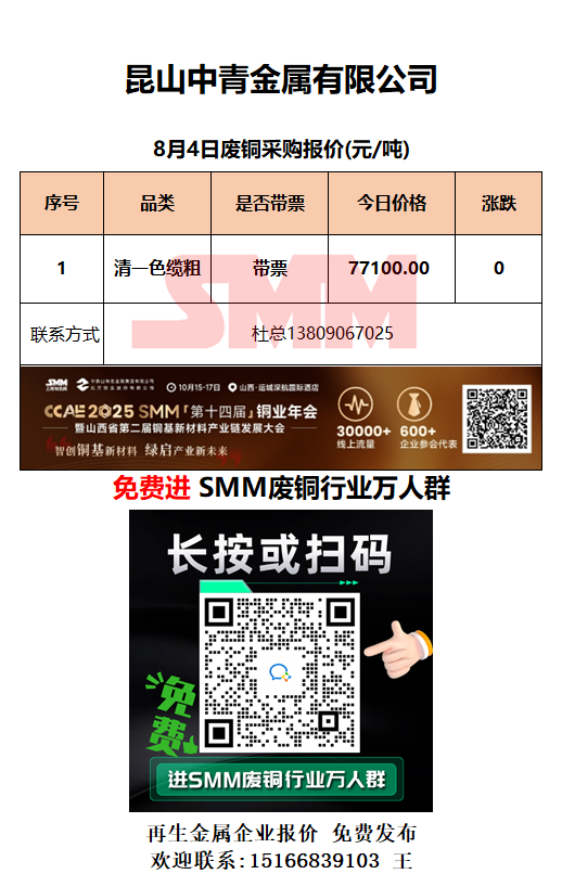 今日昆山中青 废铜采购报价已更新,有货的朋友欢迎联系我们!