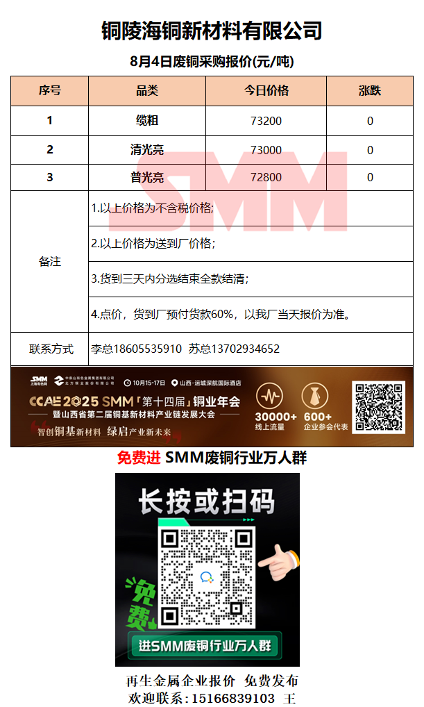 今日铜陵海铜 废铜采购报价已更新,有货的朋友欢迎联系我们!