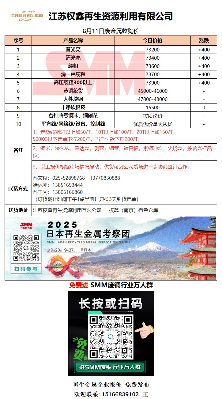 8月11日江苏权鑫 废铜采购报价