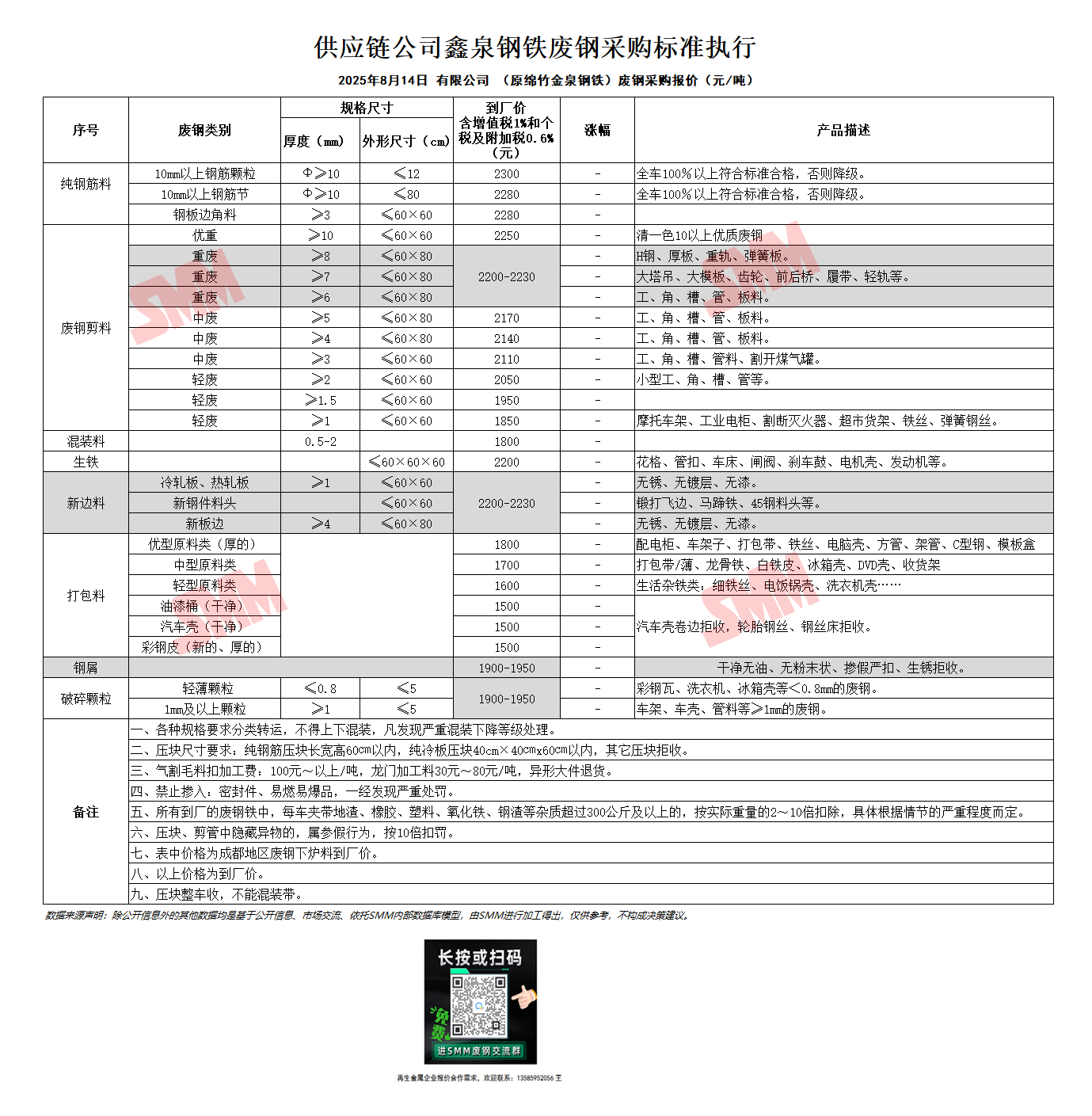 8月14日鑫泉钢铁(原绵竹金泉钢铁) 废钢采购报价