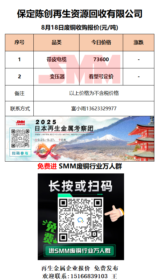 今日保定陈创 废铜采购报价已更新,有货的朋友欢迎联系我们!