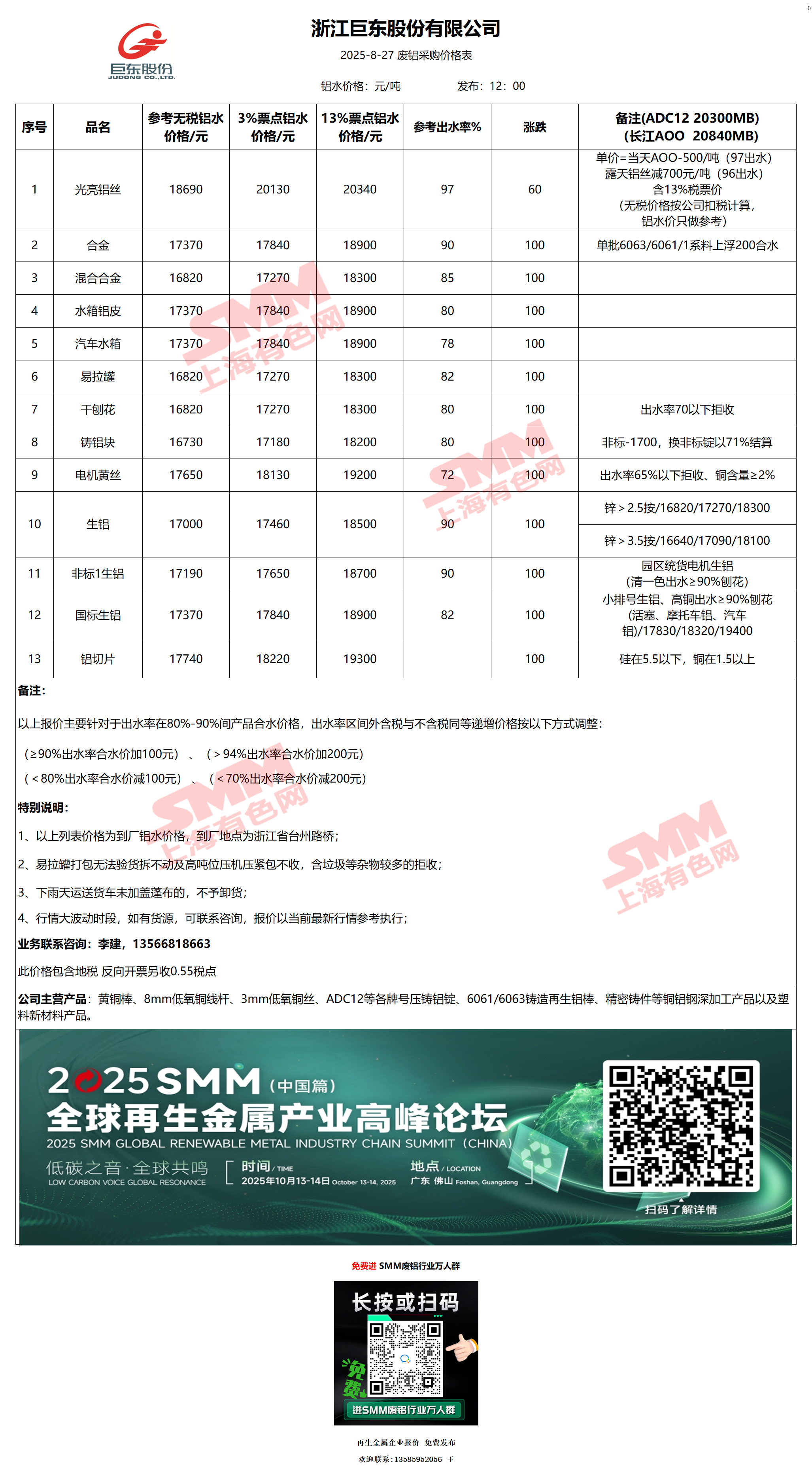 8月27日浙江巨东 废铝采购报价