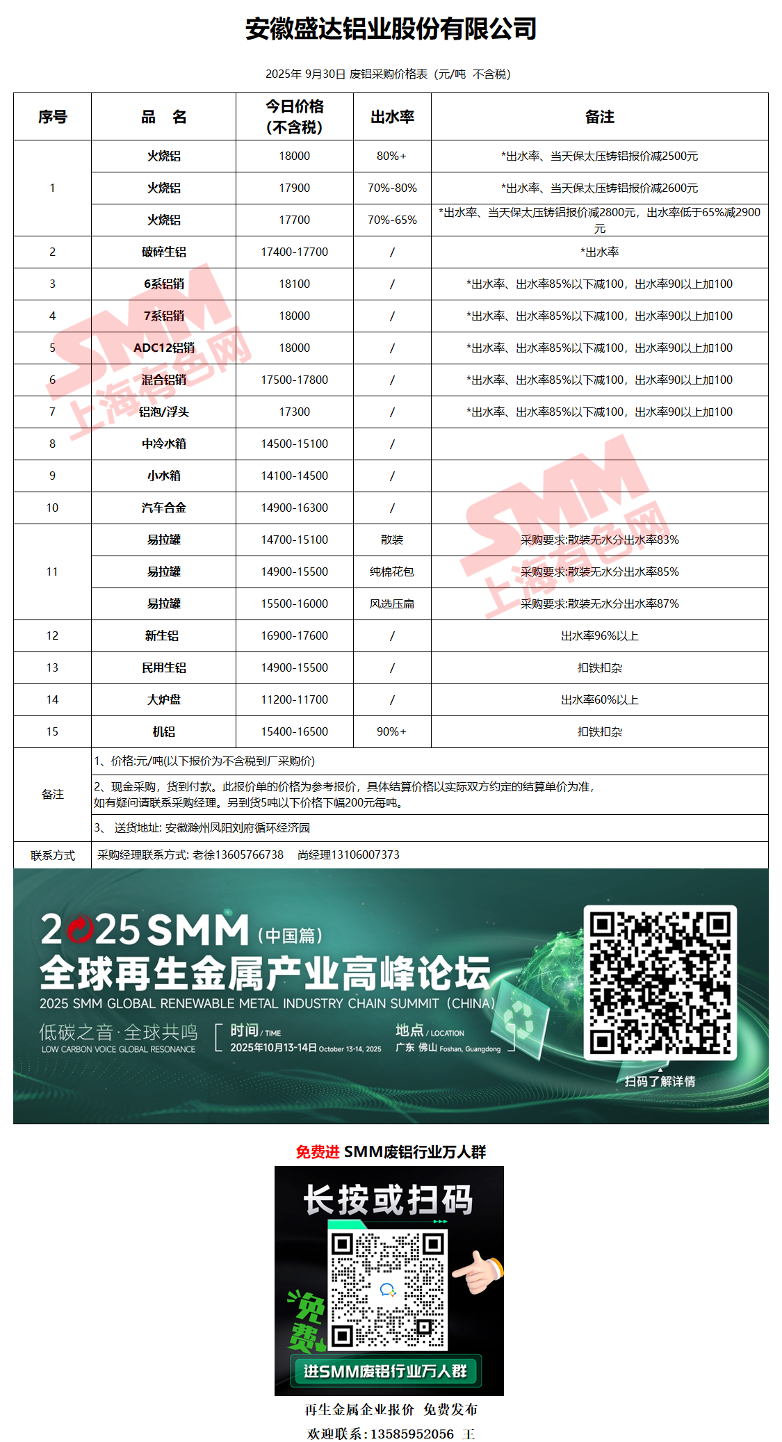 今日安徽盛达 废铝采购报价已更新,有货的朋友欢迎联系我们!