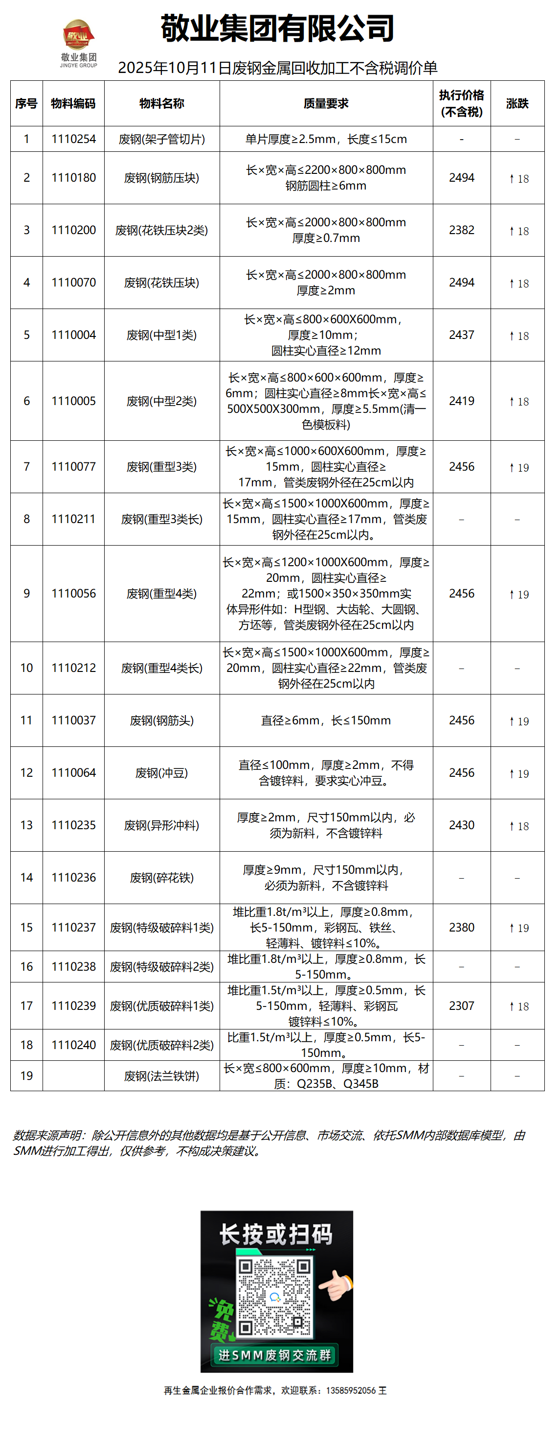 10月11日敬业钢铁本部 废钢采购报价