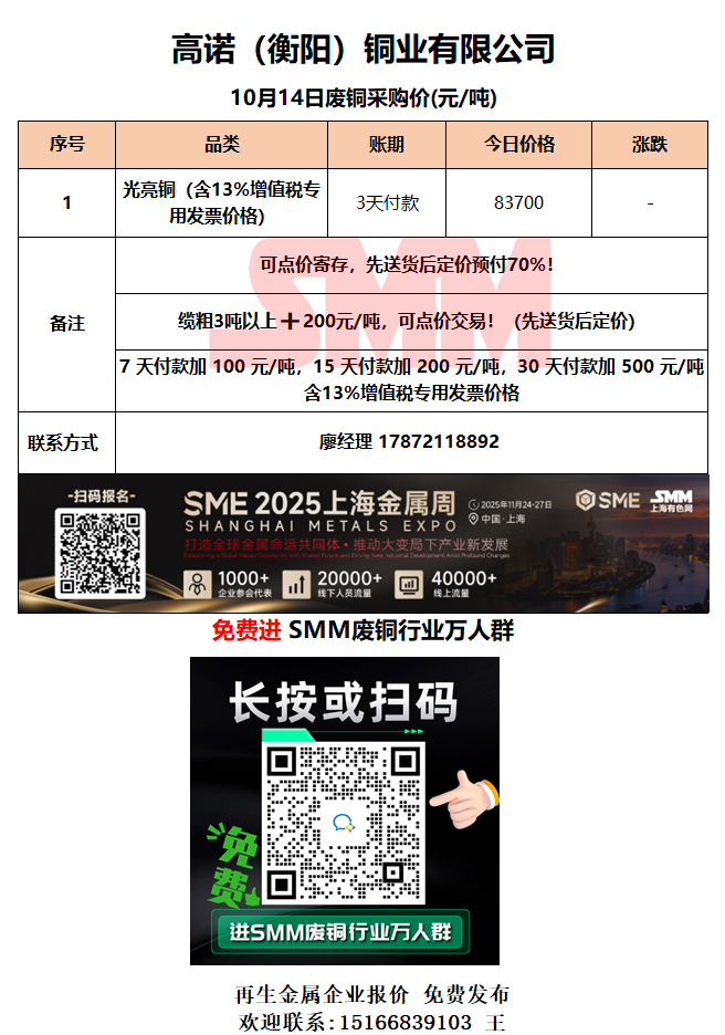 10月14日高诺(衡阳)铜业 废铜采购报价