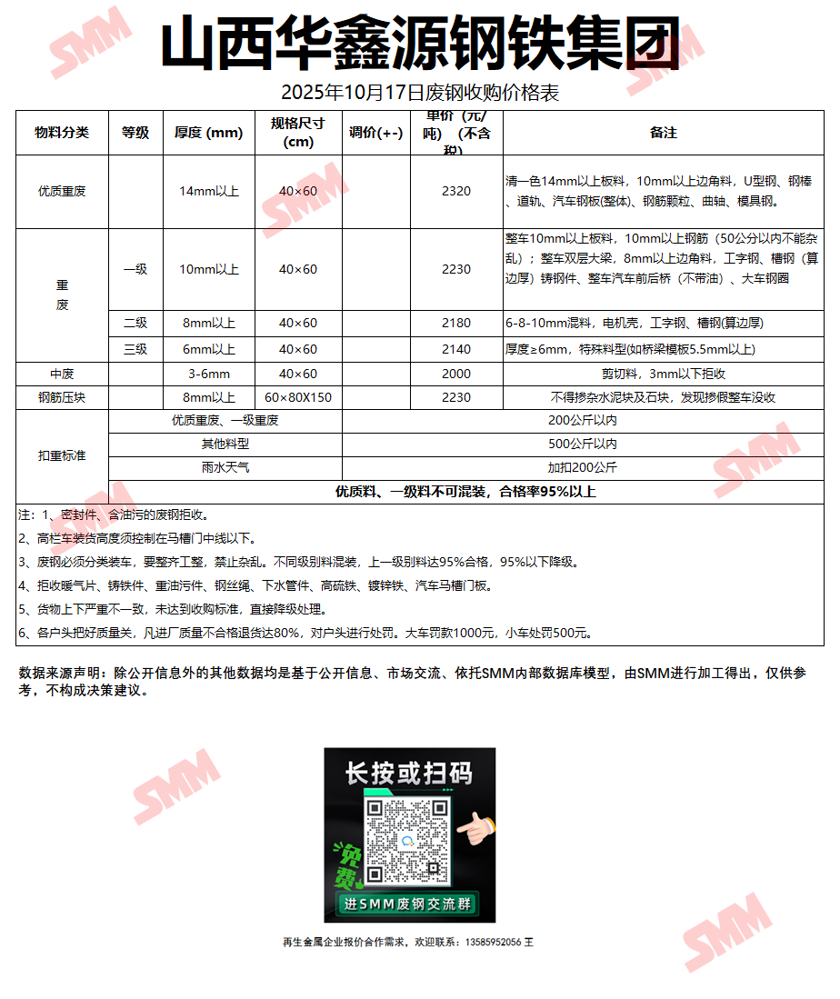 10月17日山西华鑫源 废钢收购报价