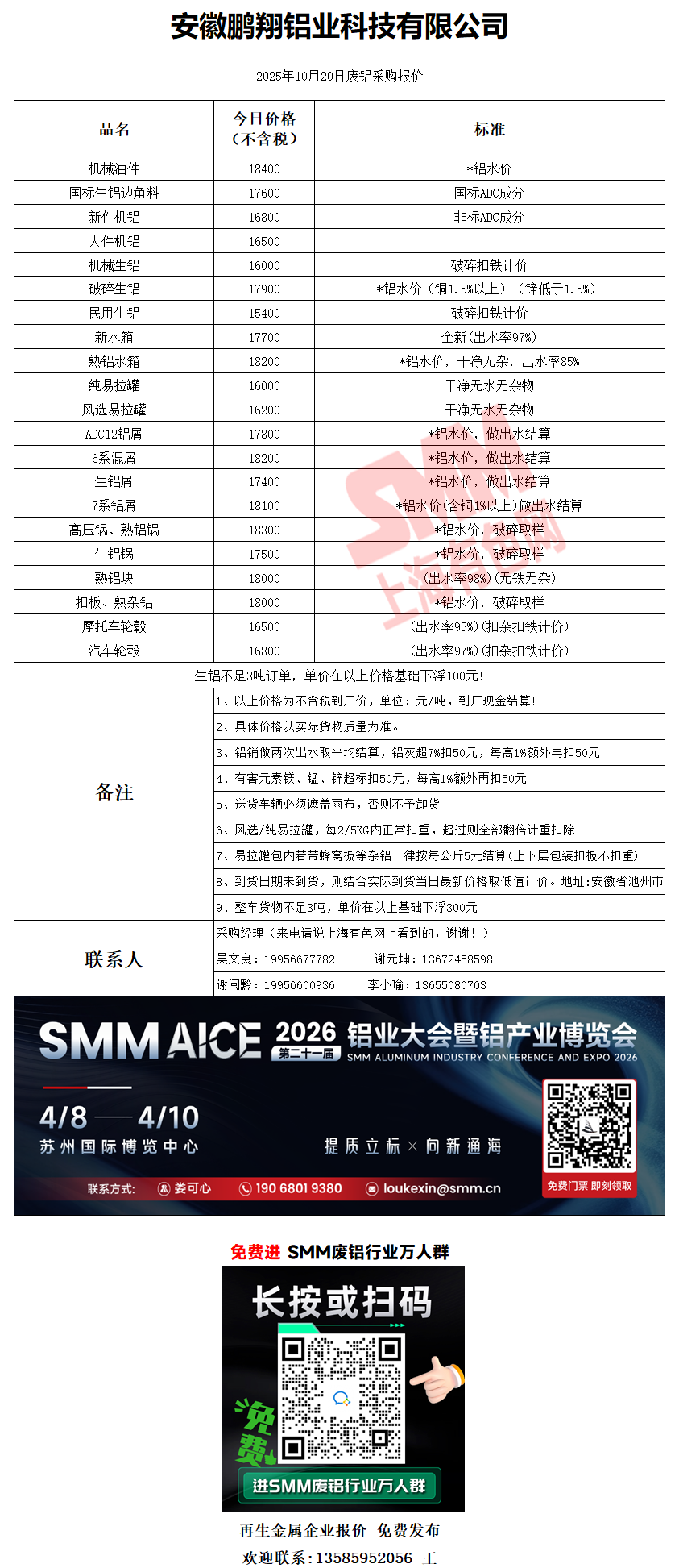 10月20日安徽鹏翔 废铝采购报价