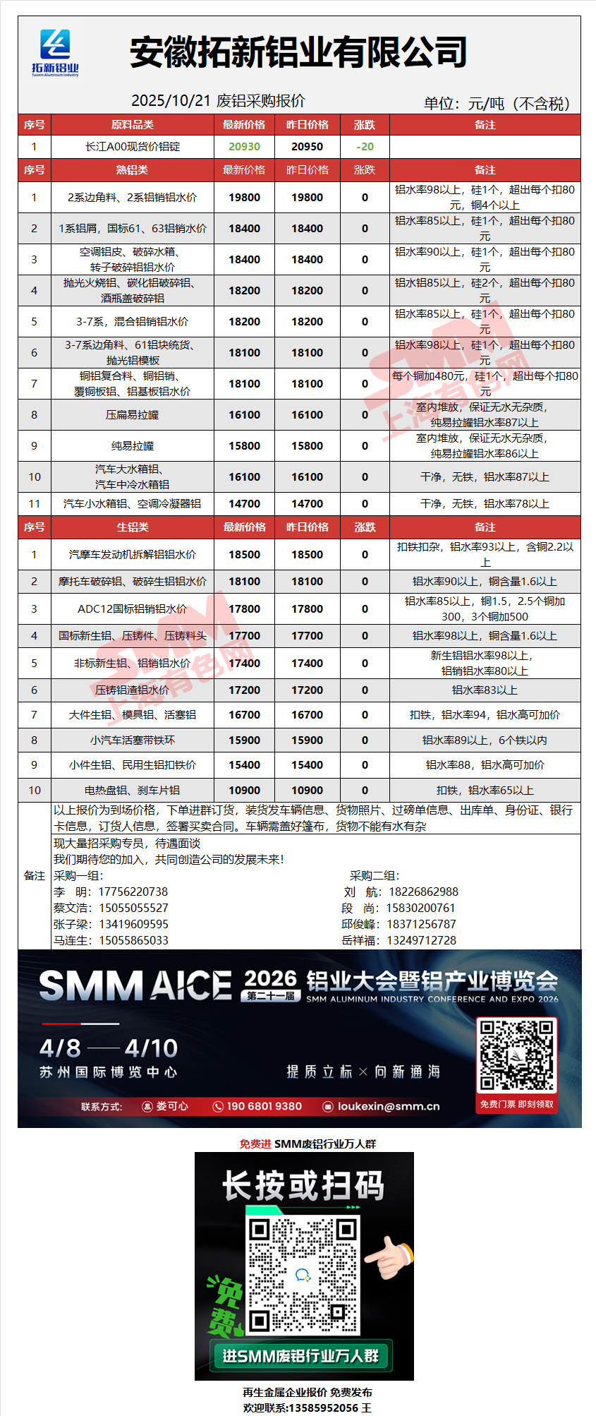 今日拓新铝业 废铝采购报价已更新,有货的朋友欢迎联系我们!