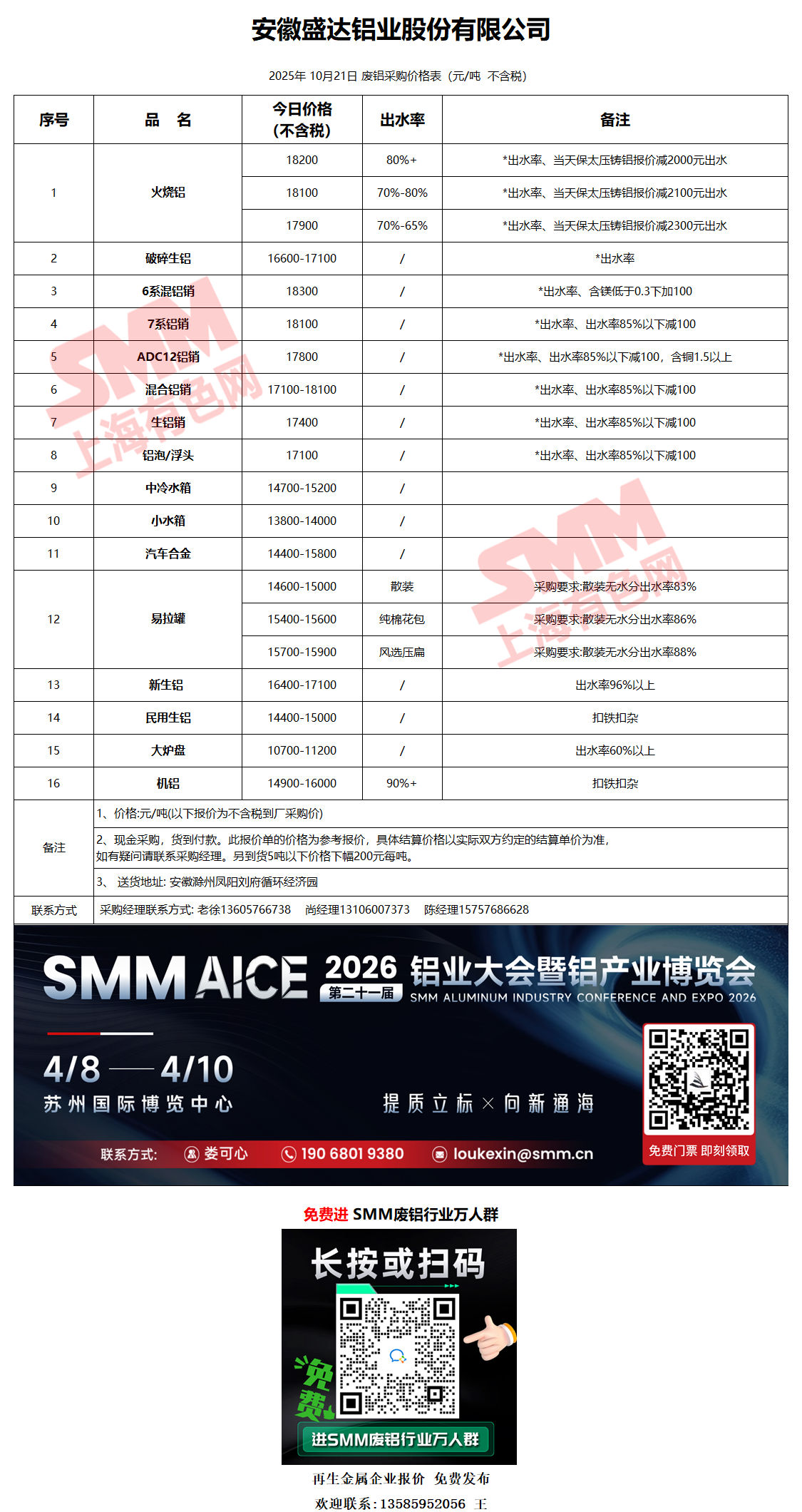 10月21日安徽盛达 废铝采购报价