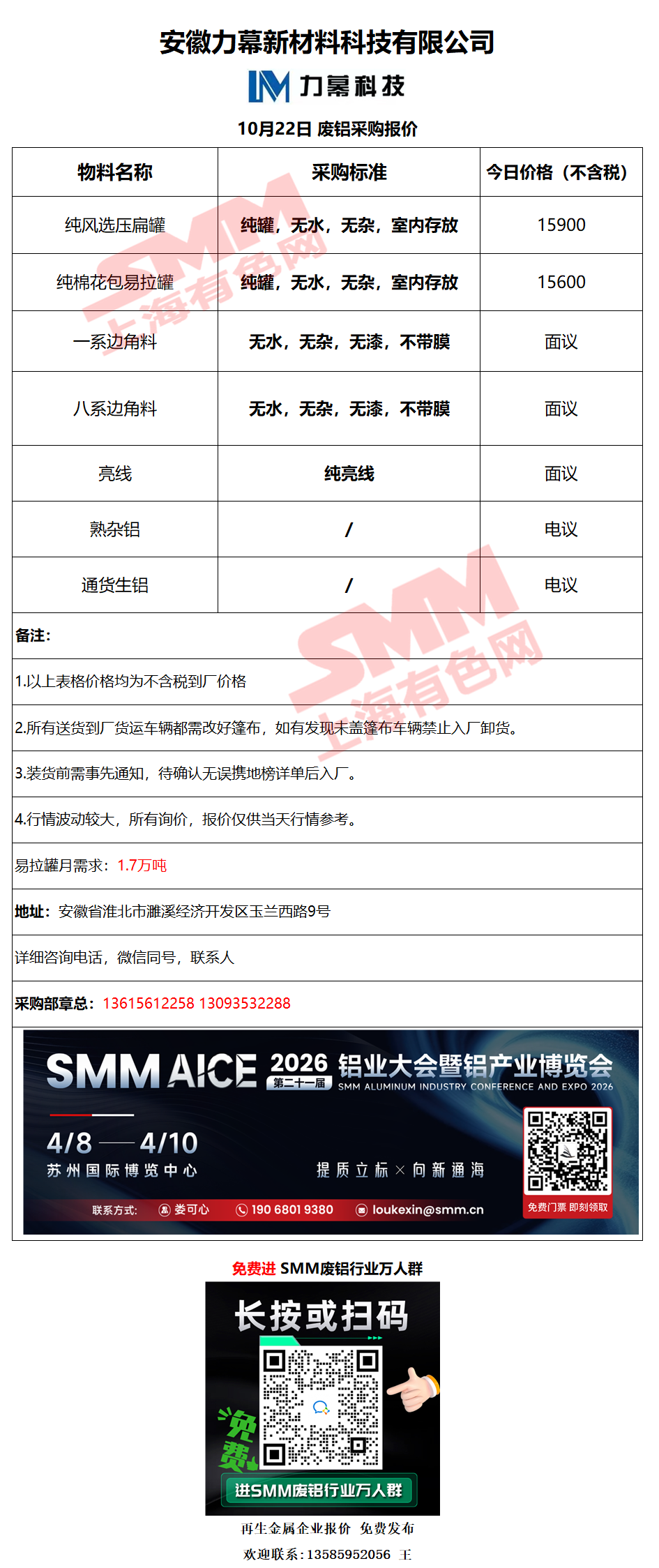 10月22日安徽力幕 废铝采购报价
