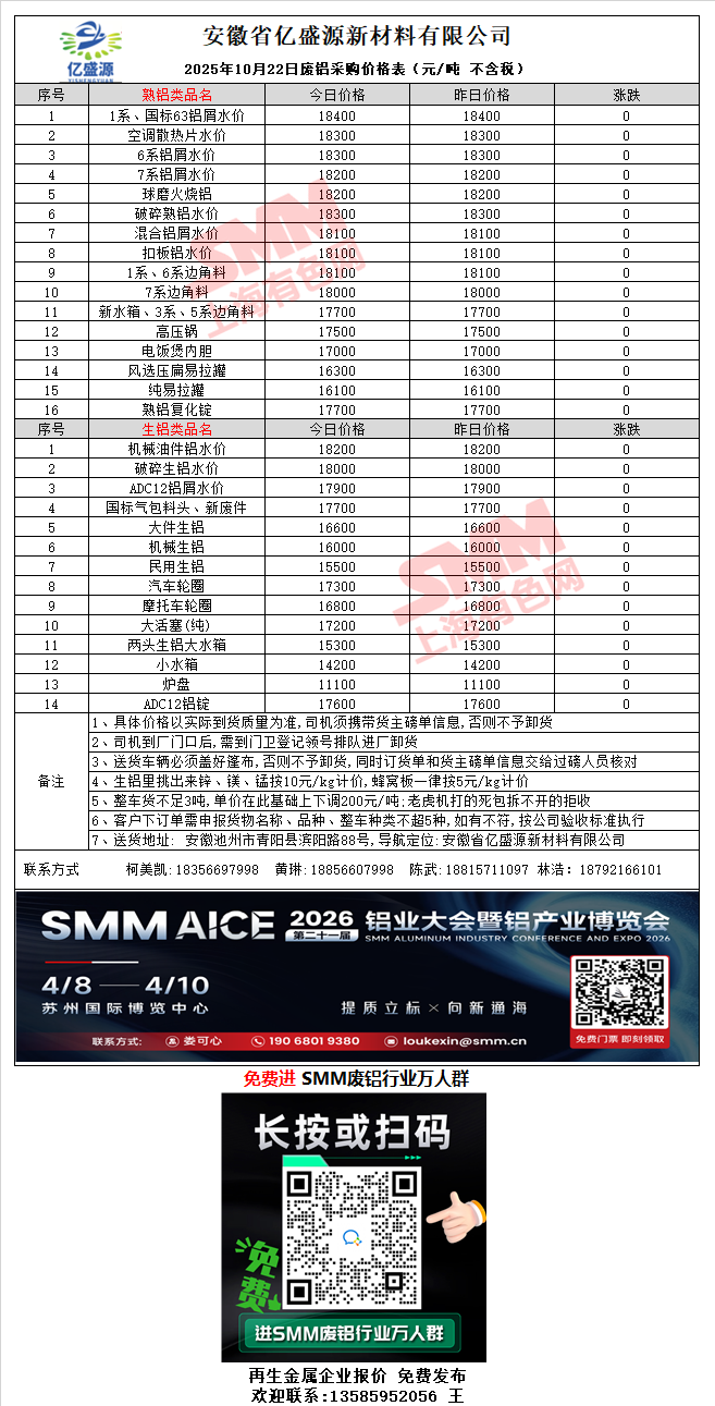 10月22日安徽亿盛源 废铝采购报价