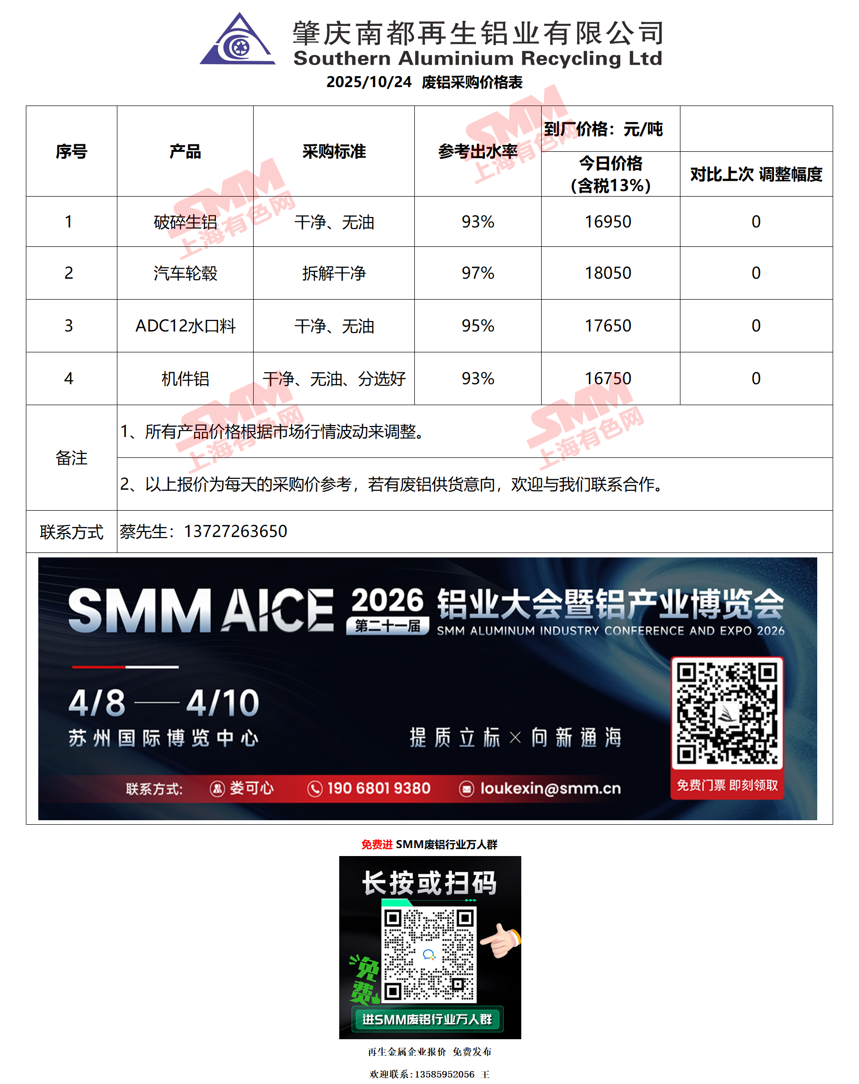 今日南都再生铝业 废铝采购报价已更新,有货的朋友欢迎联系我们!