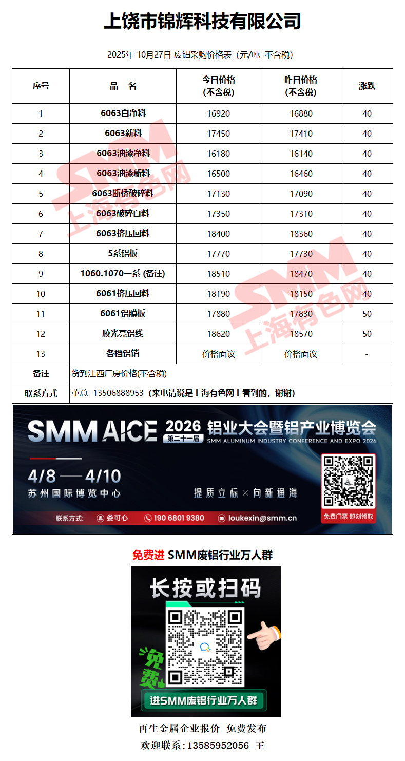 10月27日上饶锦辉 废铝采购报价