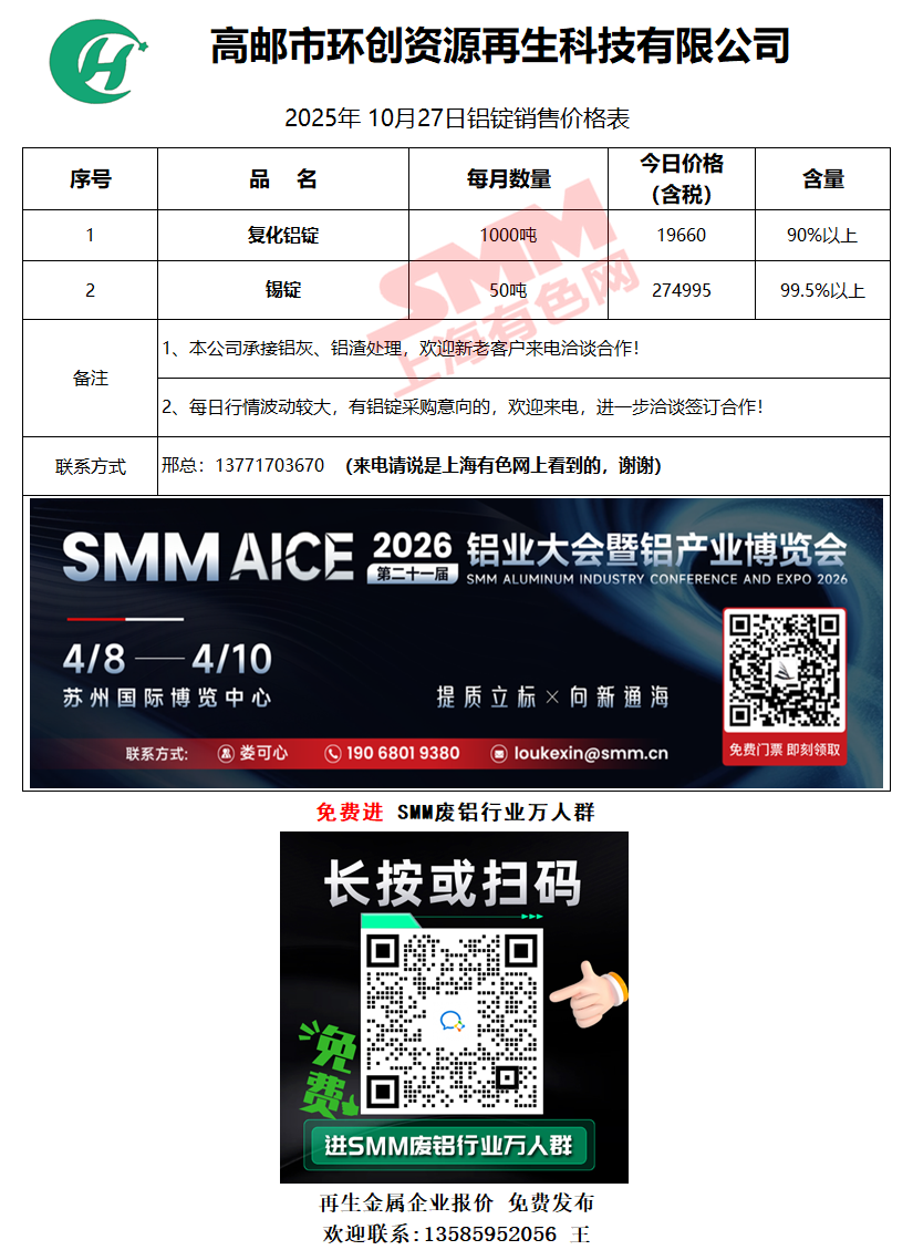 10月27日高邮环创铝业 废铝销售报价