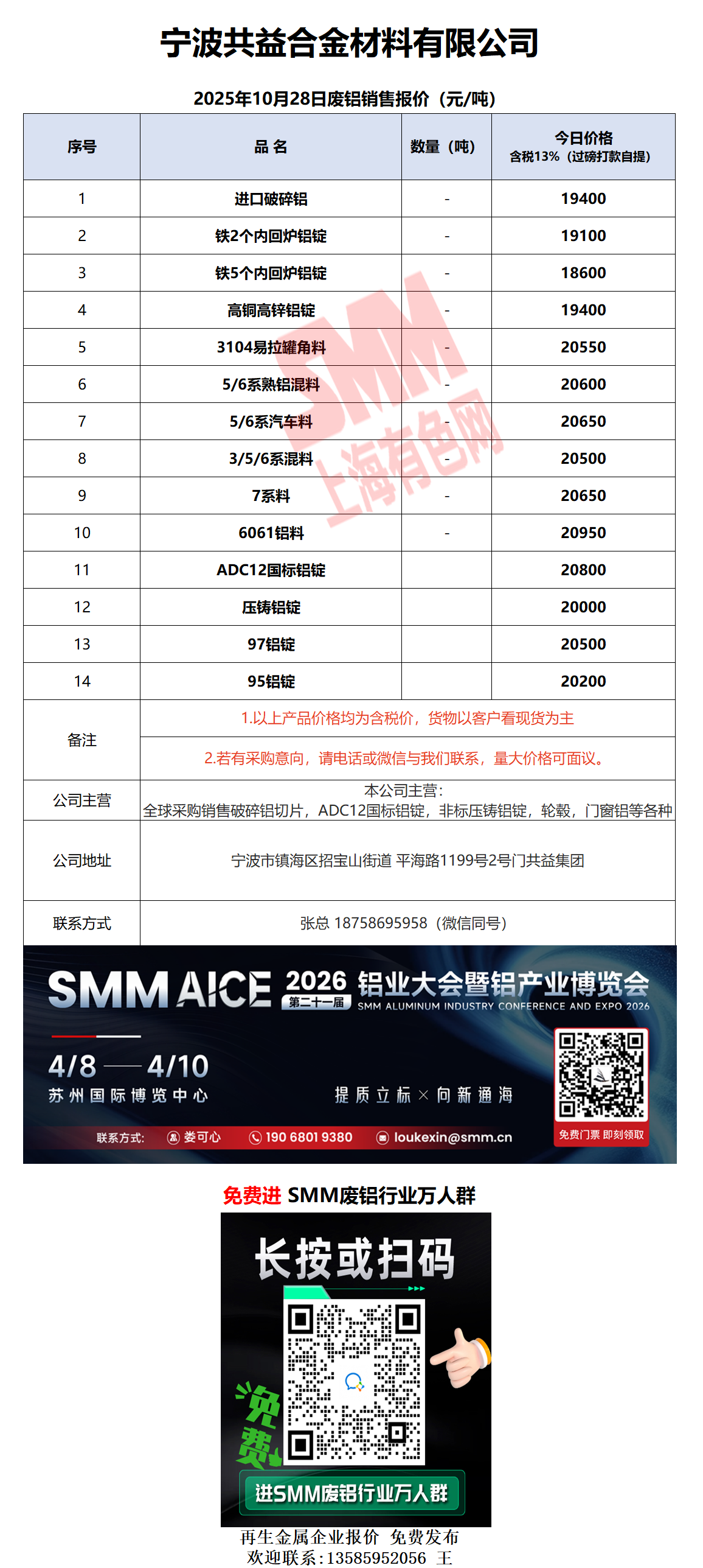 10月28日宁波共益 废铝销售报价