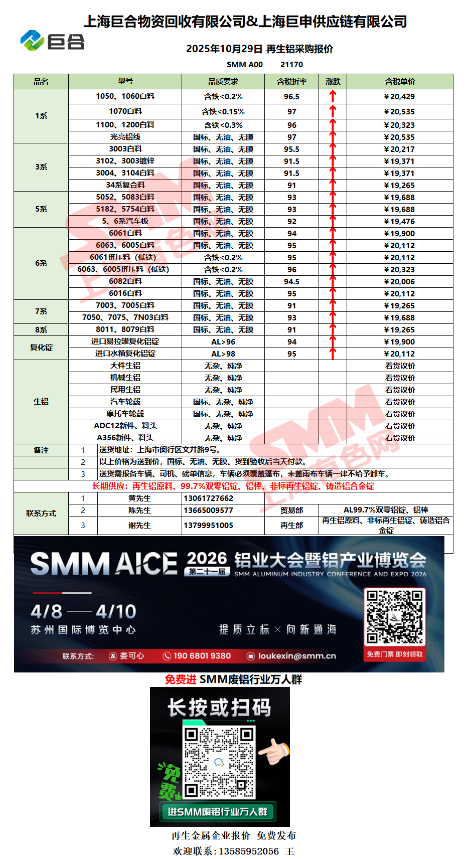 今日上海巨合 废铝采购报价已更新,有货的朋友欢迎联系我们!