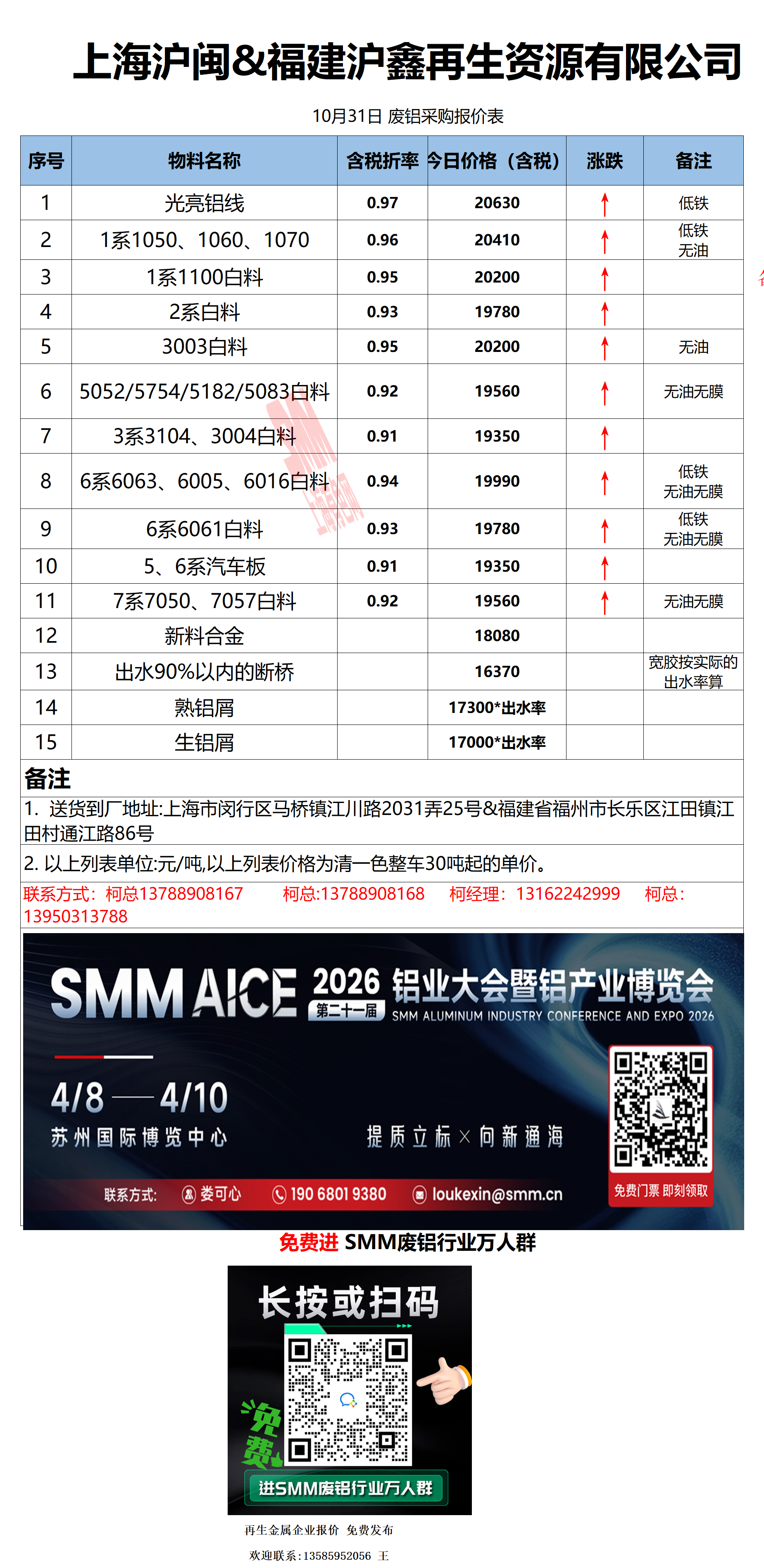 10月31日上海沪闽&福建沪鑫 废铝采购报价