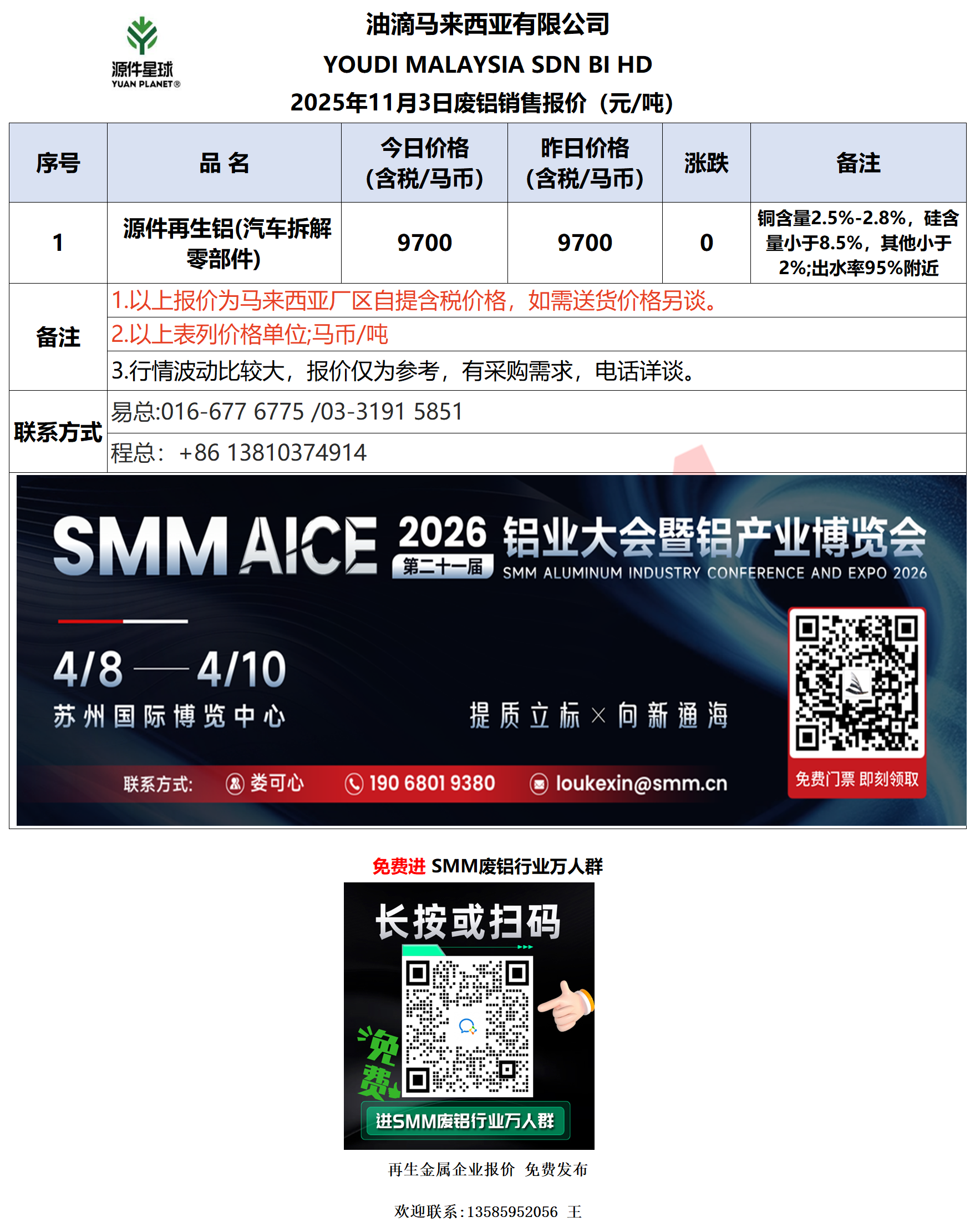 11月3日油滴马来西亚 废铝销售报价
