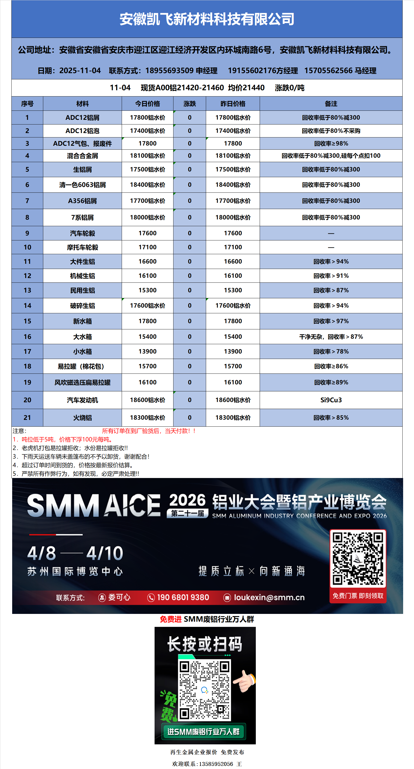 11月4日安徽凯飞 废铝采购报价