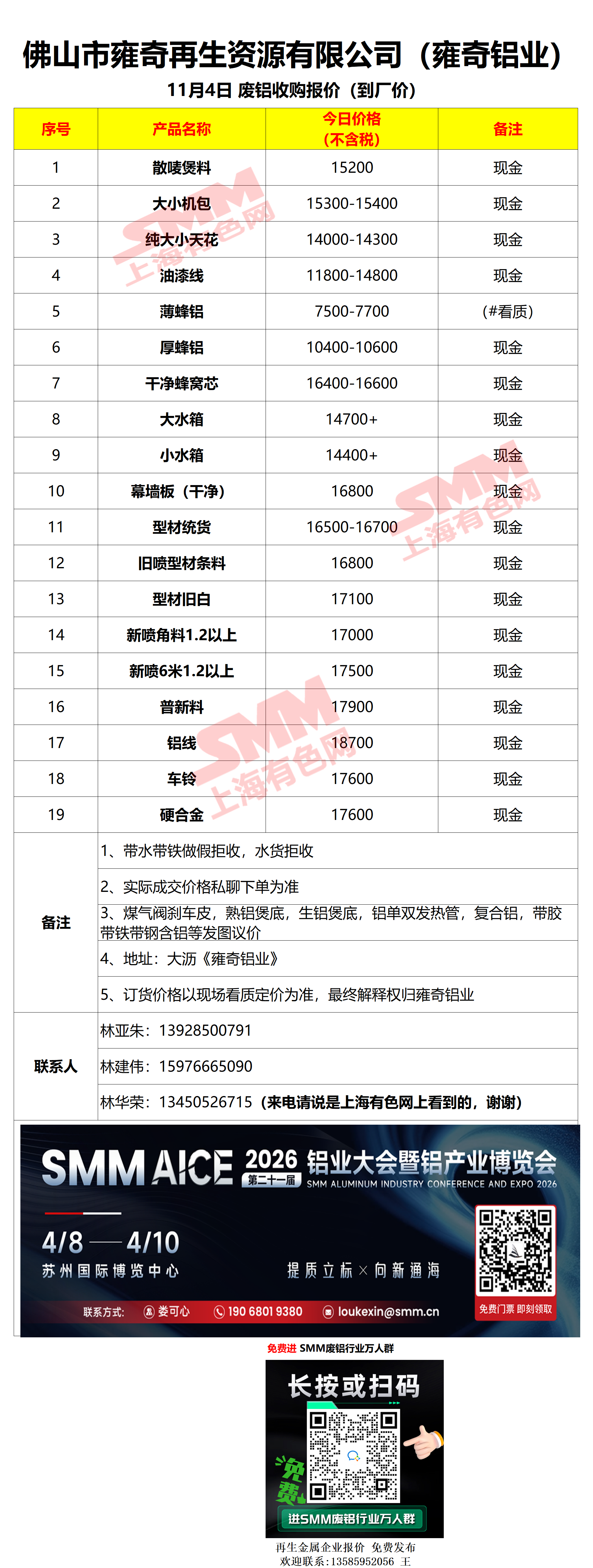 今日佛山雍奇 废铝采购报价已更新,有货的朋友欢迎联系我们!
