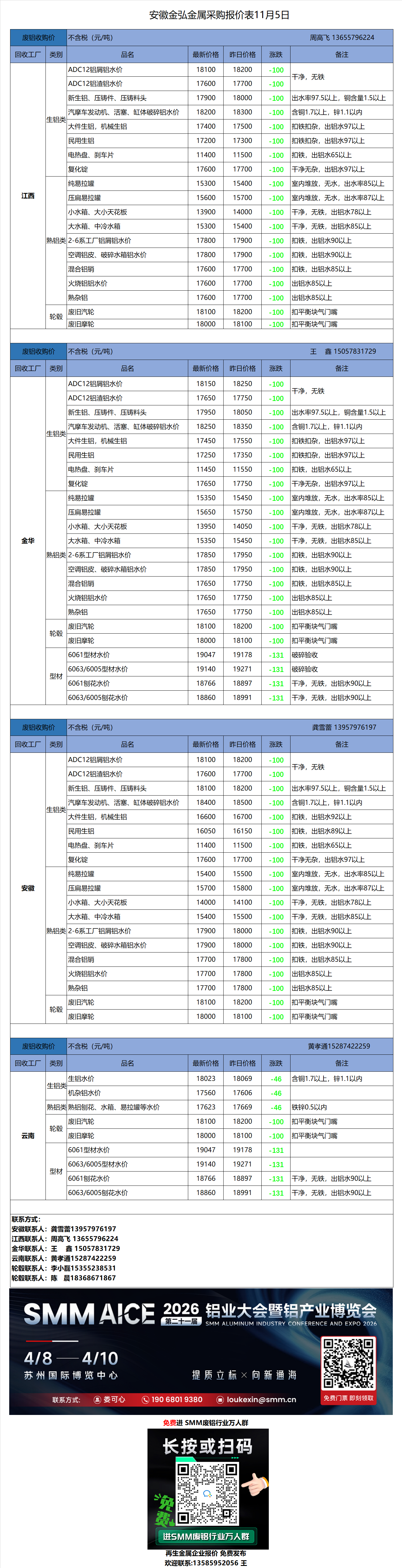 今日安徽金弘 废铝采购报价已更新,有货的朋友欢迎联系我们!
