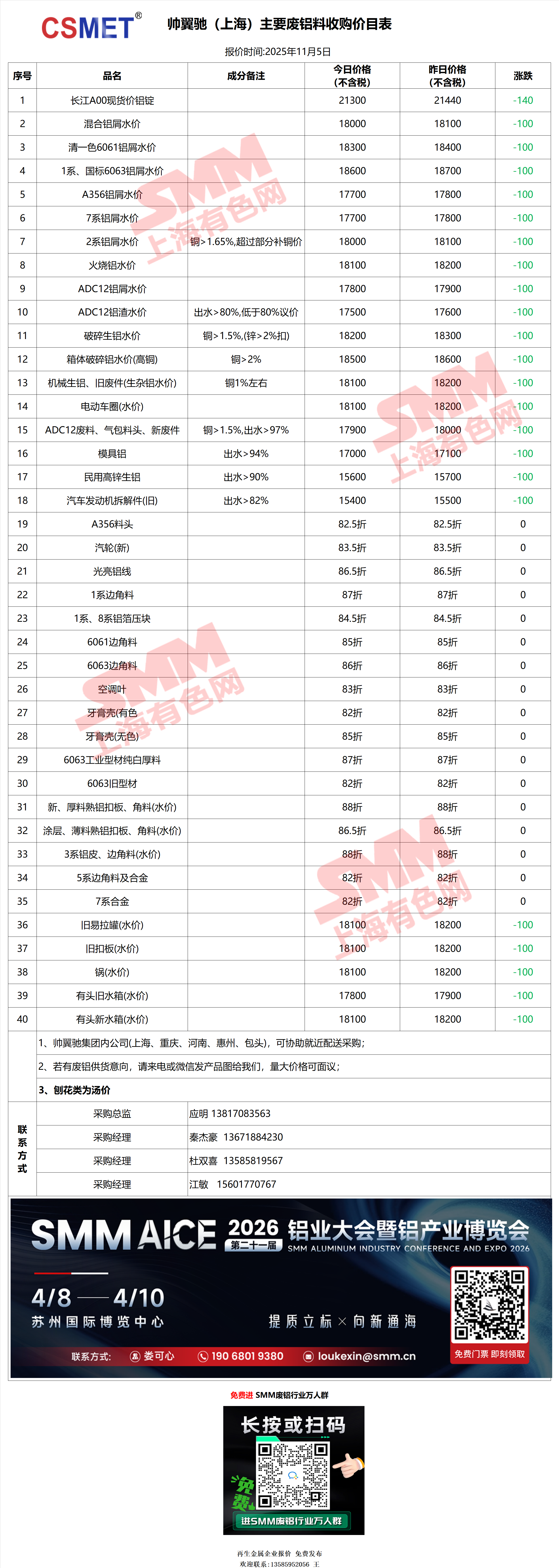 11月5日帅翼驰(上海) 废铝采购报价