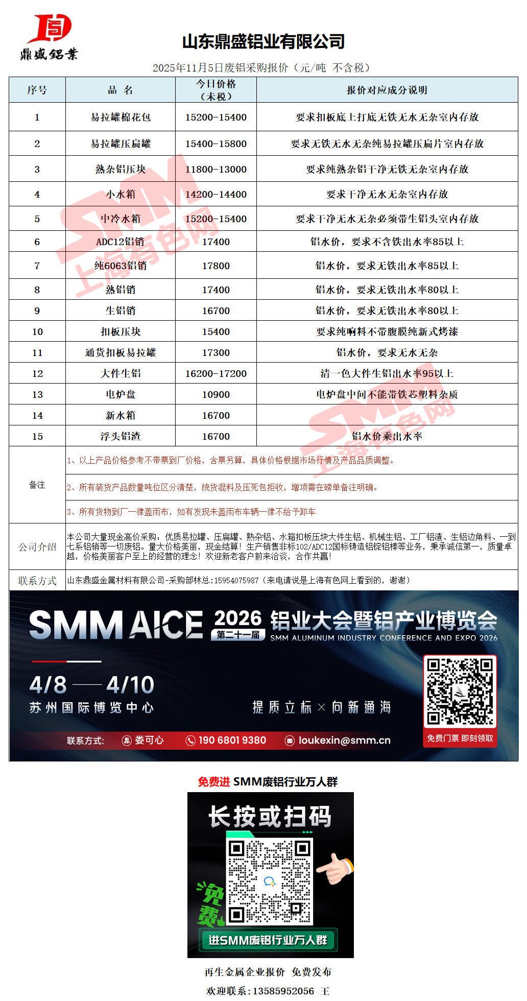 今日山东鼎盛 废铝采购报价已更新,有货的朋友欢迎联系我们!