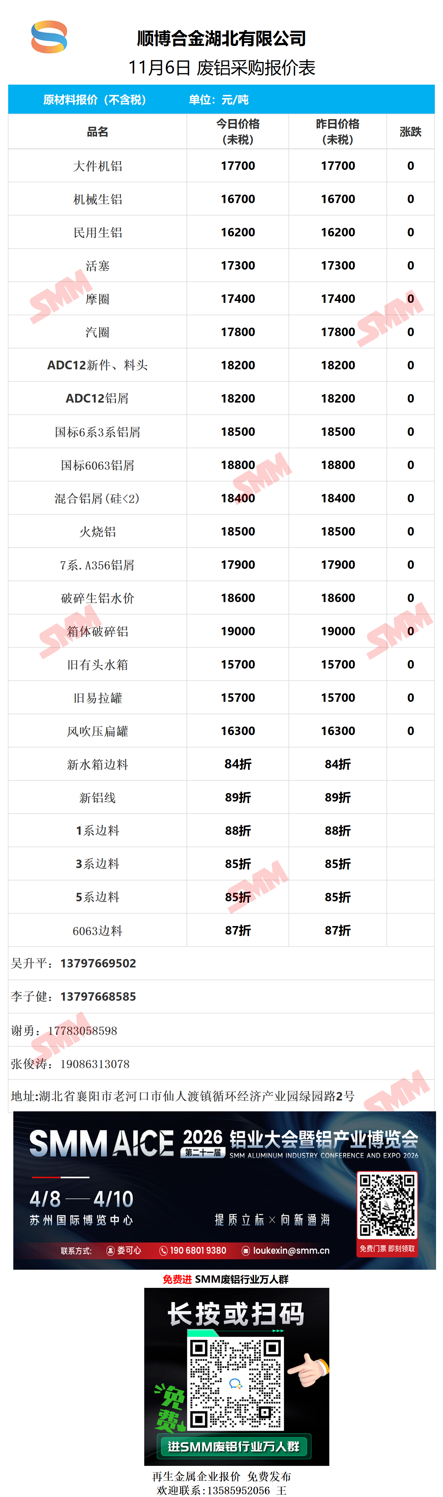 11月6日顺博合金湖北 废铝采购报价