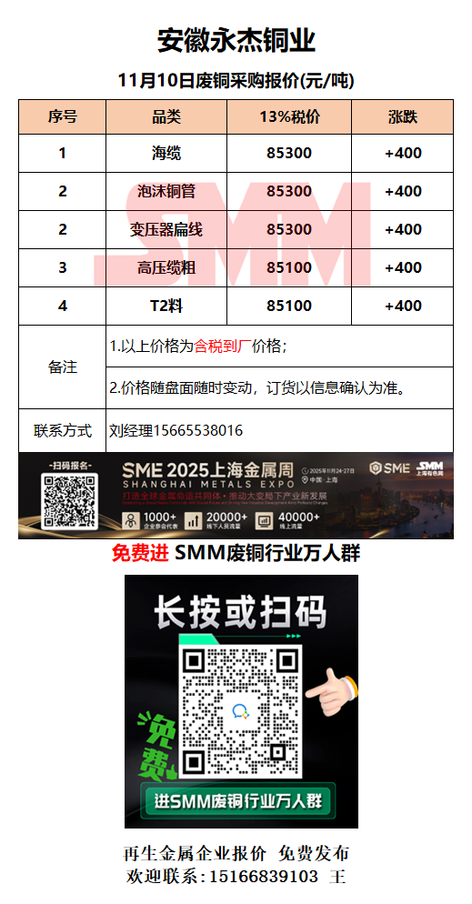 11月10日安徽永杰 废铜采购报价
