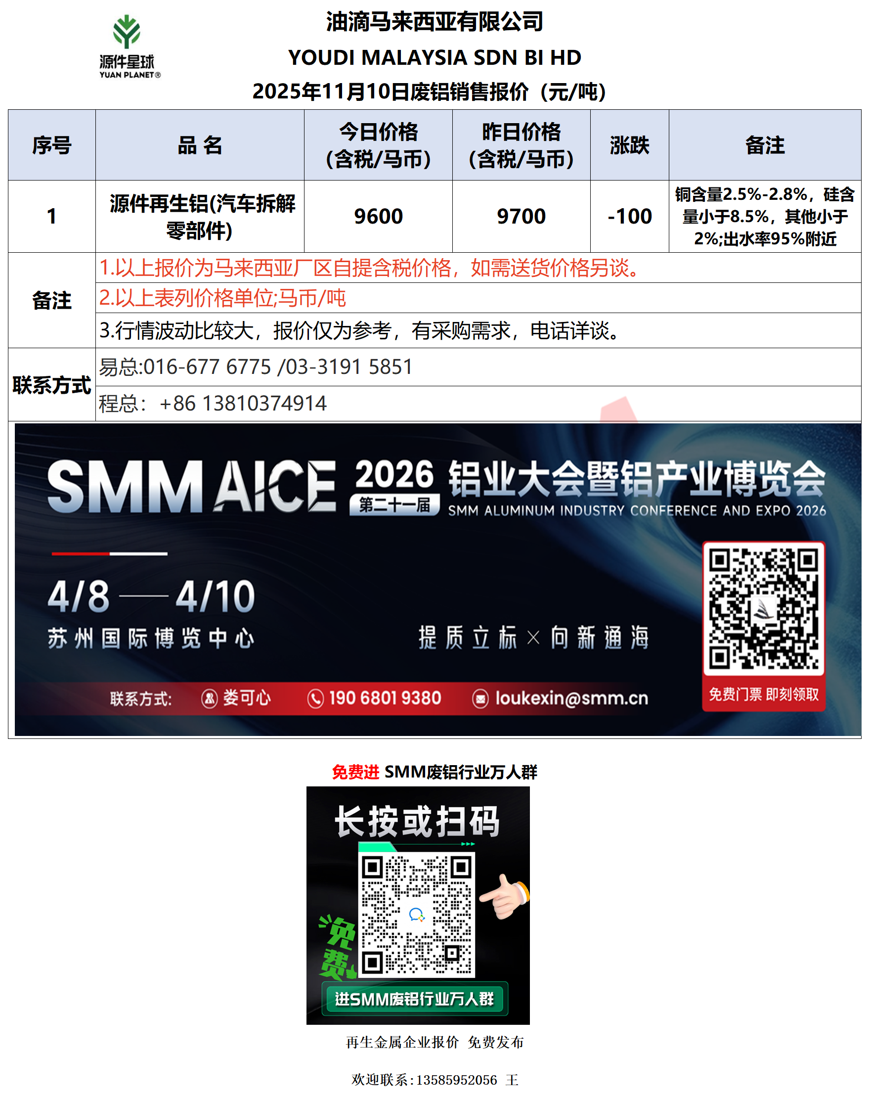 11月10日油滴马来西亚 废铝销售报价
