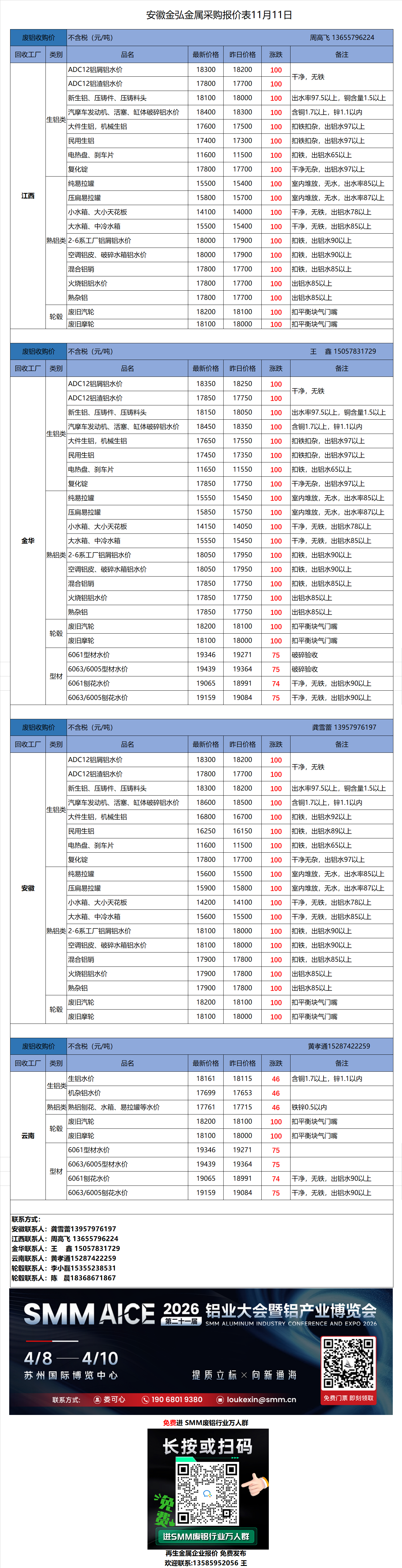 11月11日安徽金弘 废铝采购报价
