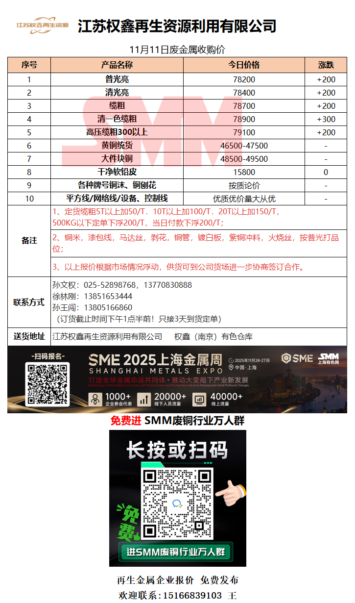11月11日江苏权鑫 废铜采购报价