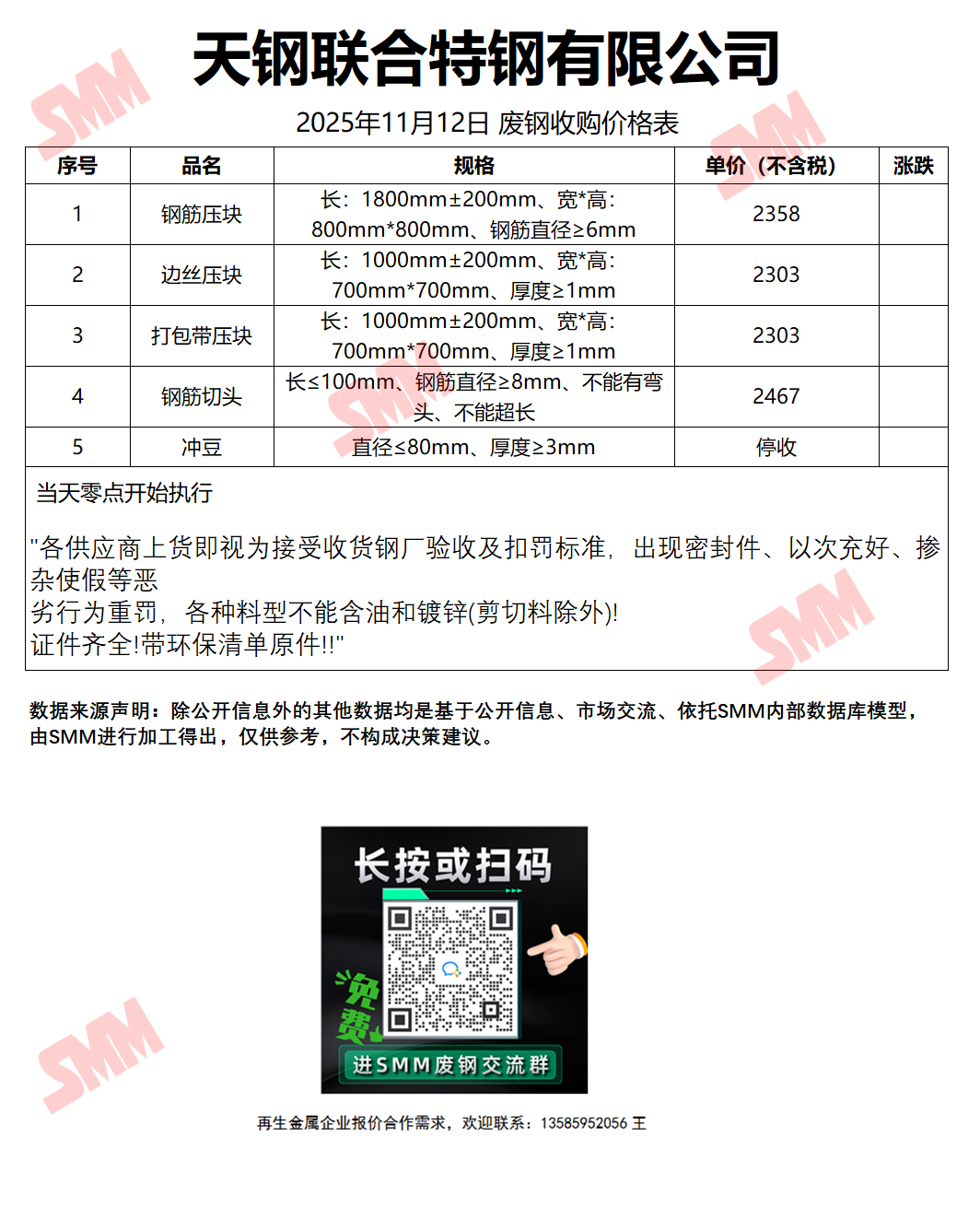 今日天钢联合特钢 废钢收购报价已更新,有货的朋友欢迎联系我们!