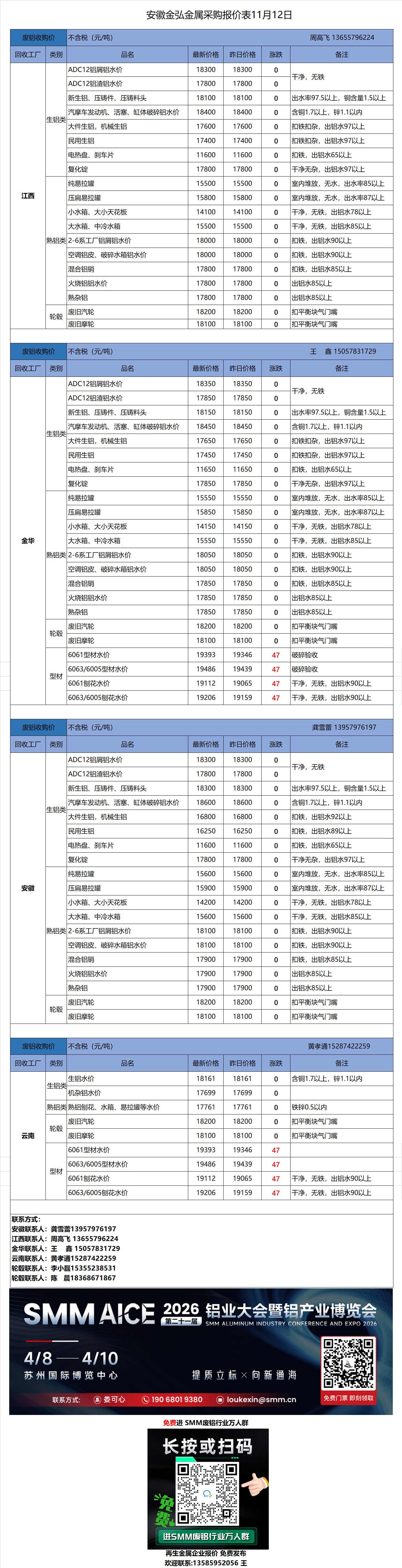 11月12日安徽金弘 废铝采购报价