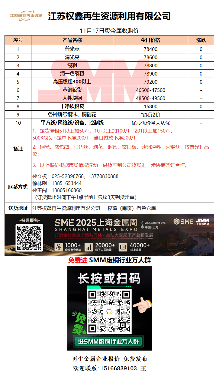 今日江苏权鑫 废铜采购报价已更新,有货的朋友欢迎联系我们!