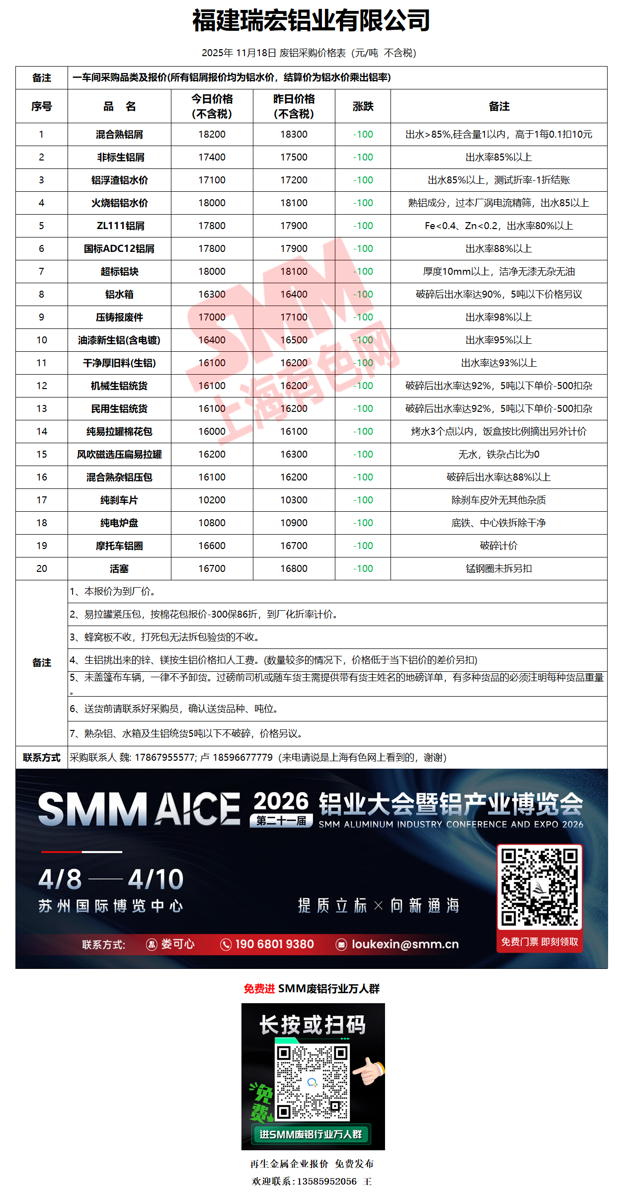 11月18日福建瑞宏 废铝采购报价
