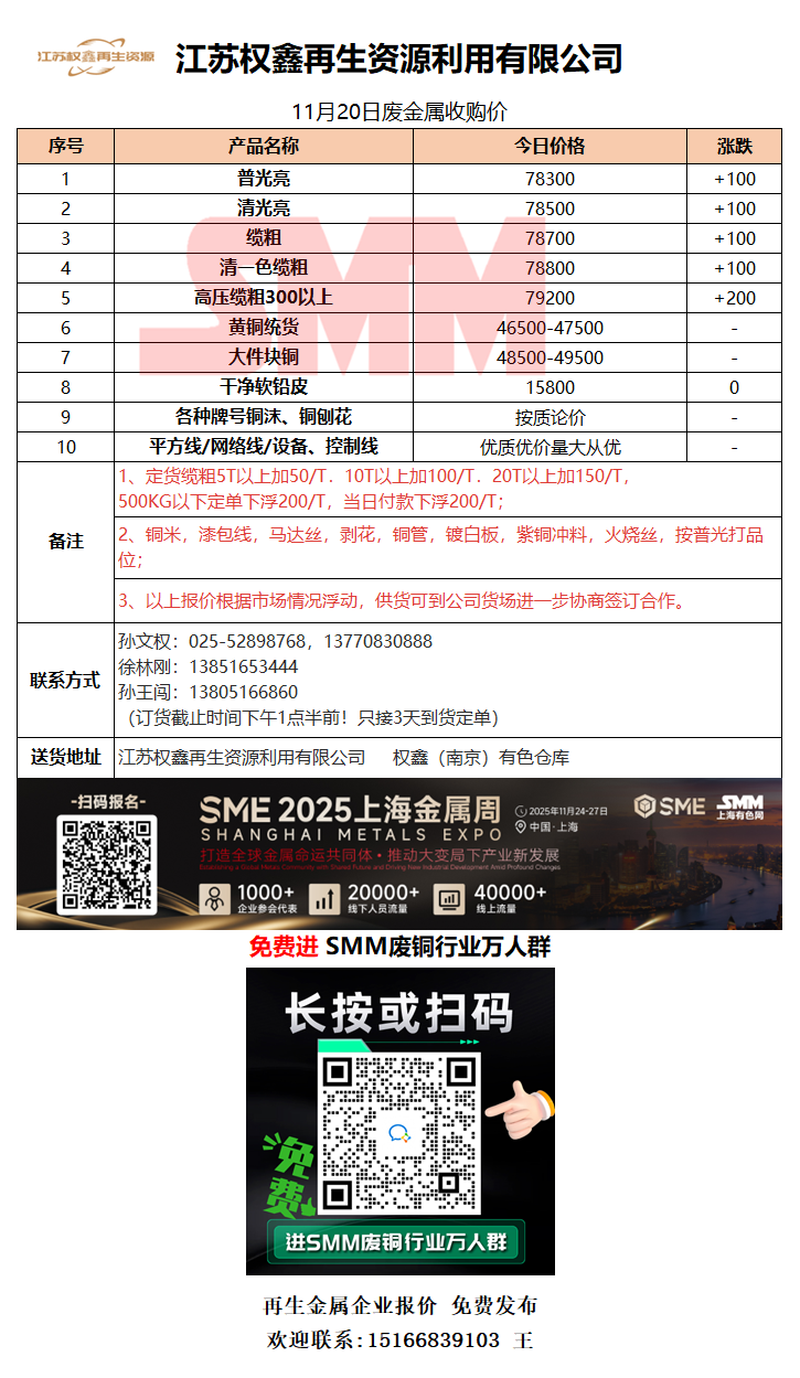 11月20日江苏权鑫 废铜采购报价
