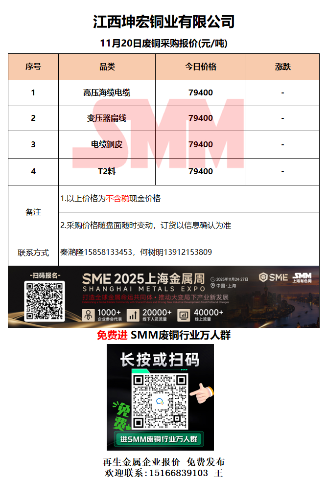 11月20日江西坤宏 废铜采购报价