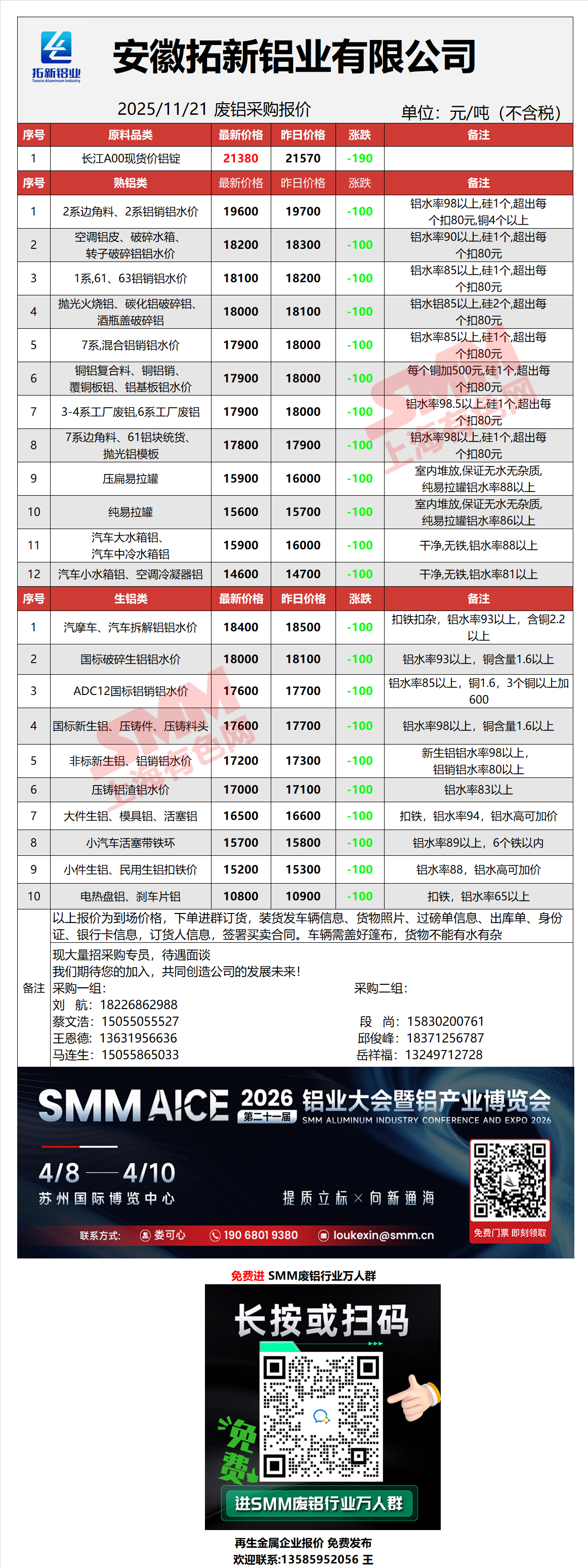 11月21日拓新铝业 废铝采购报价