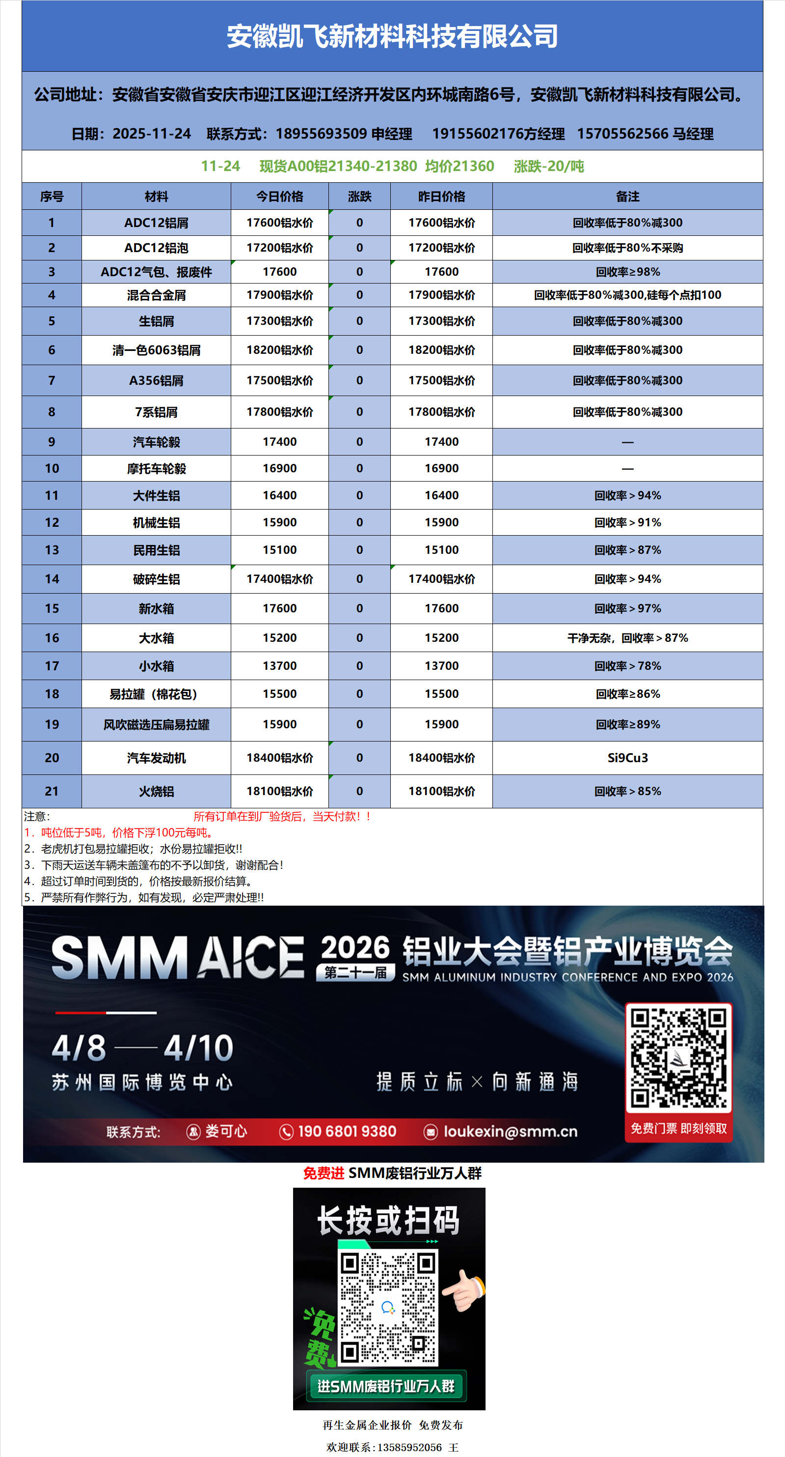 11月24日安徽凯飞 废铝采购报价