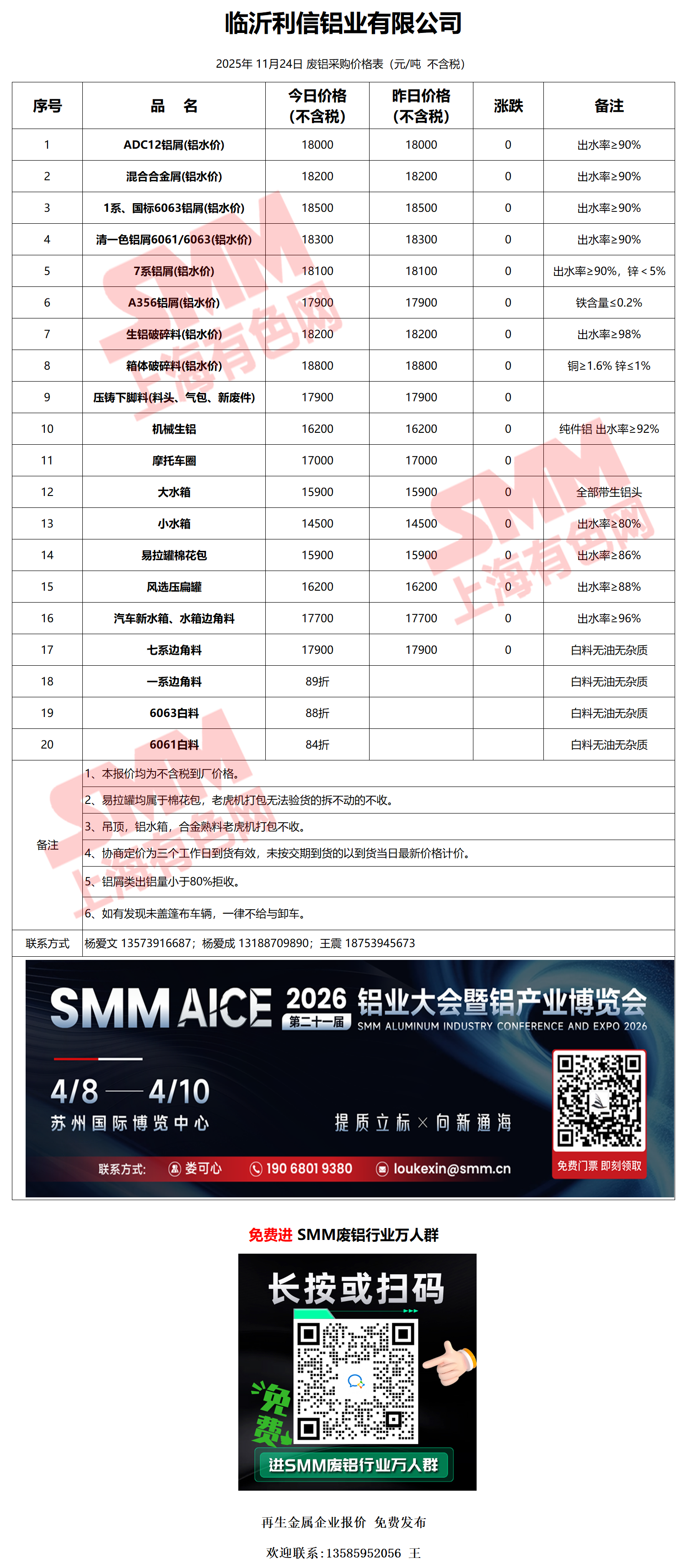 今日临沂利信 废铝采购报价已更新,有货的朋友欢迎联系我们!
