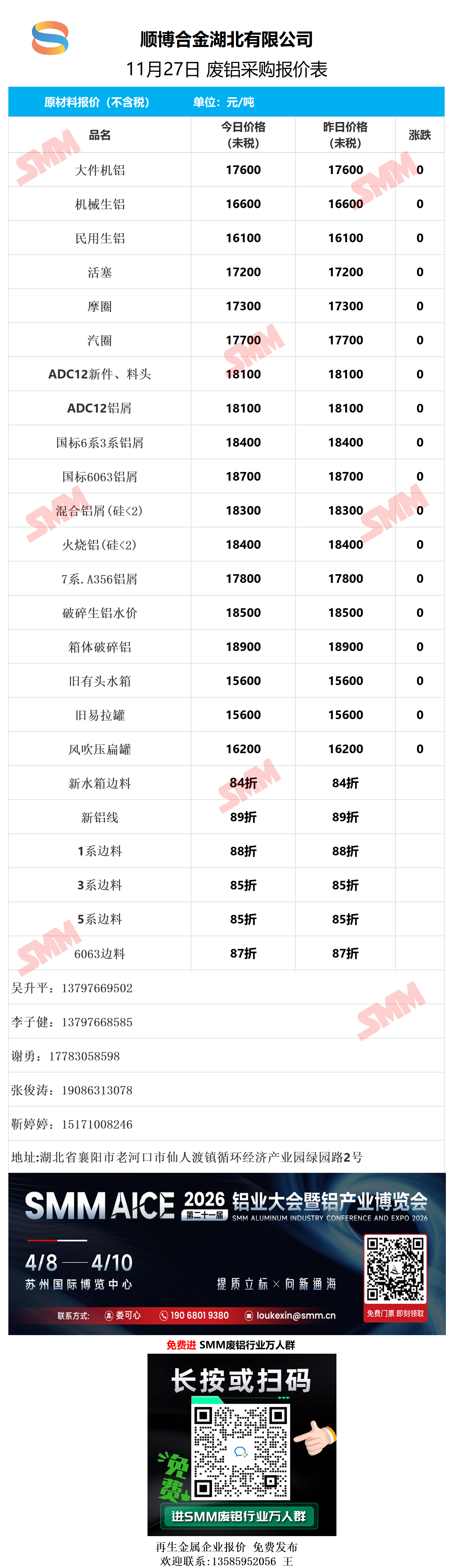11月27日顺博合金湖北 废铝采购报价