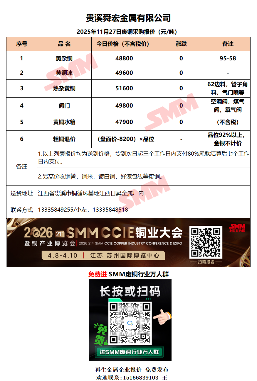 今日贵溪舜宏 废铜采购报价已更新,有货的朋友欢迎联系我们!