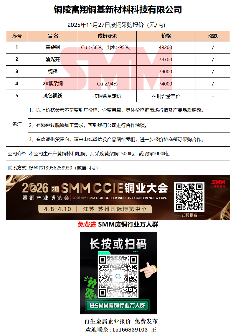 11月27日铜陵富翔 废铜采购报价