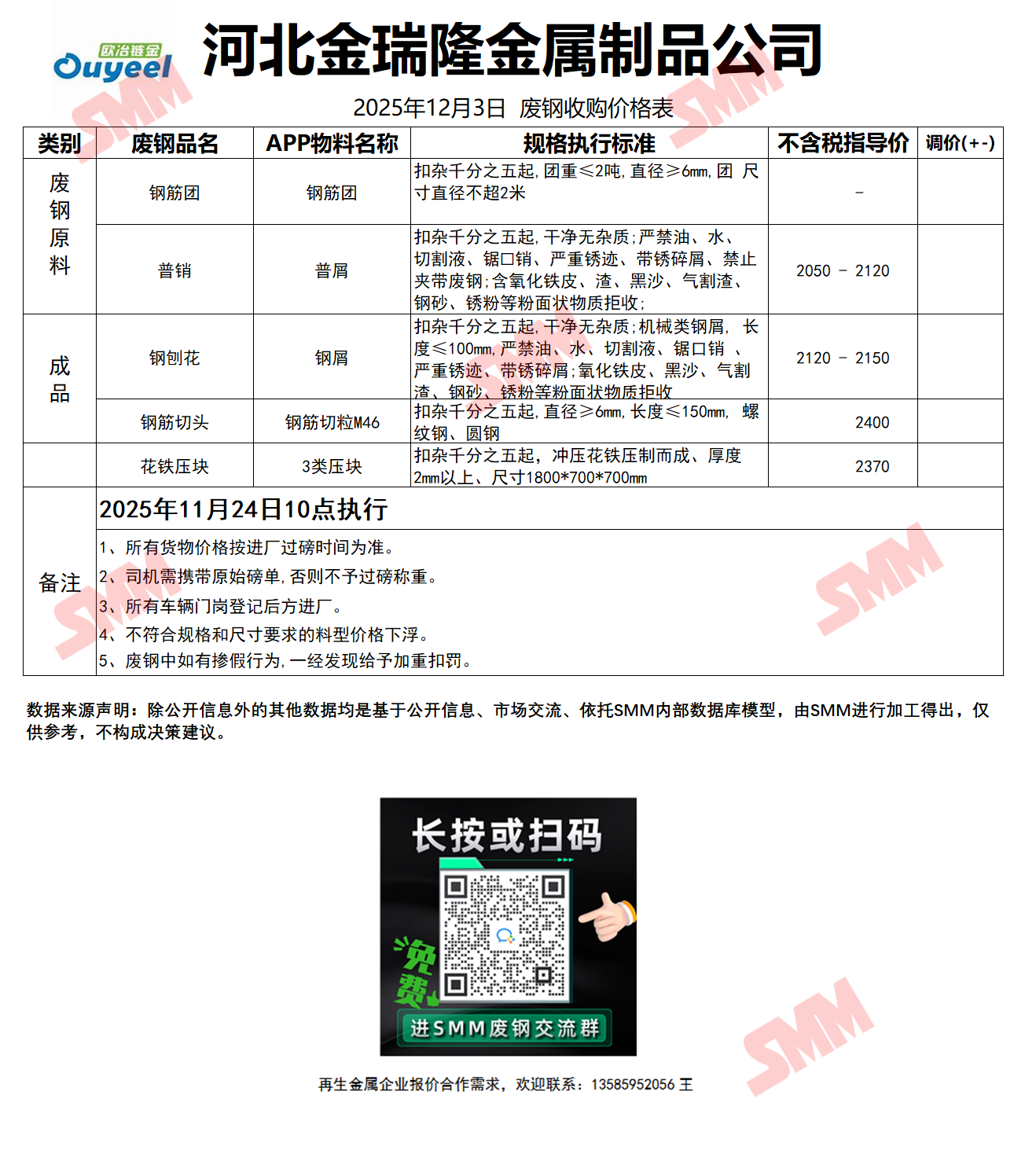 12月3日河北金瑞隆钢铁 废钢收购报价