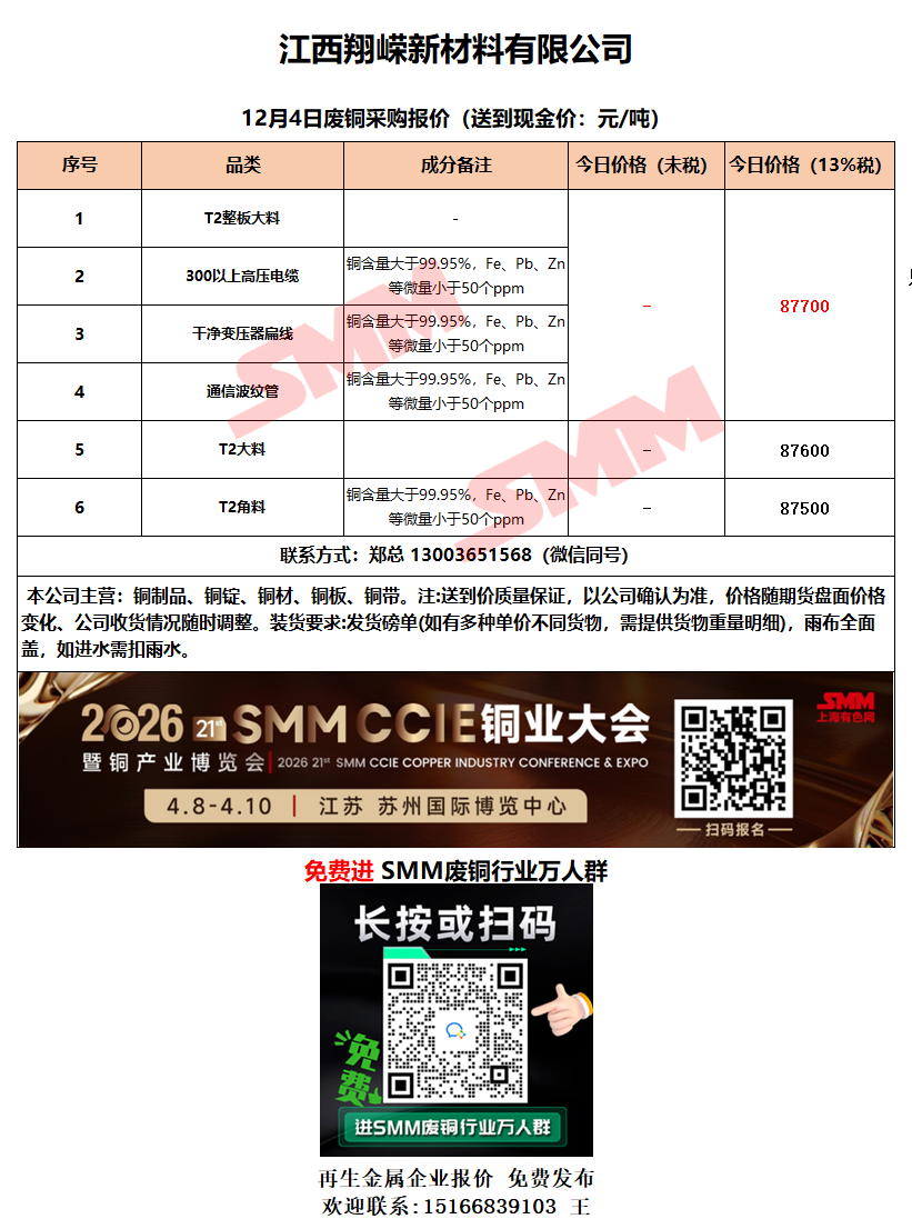 今日江西翔嵘新材料 废铜采购报价已更新,有货的朋友欢迎联系我们!