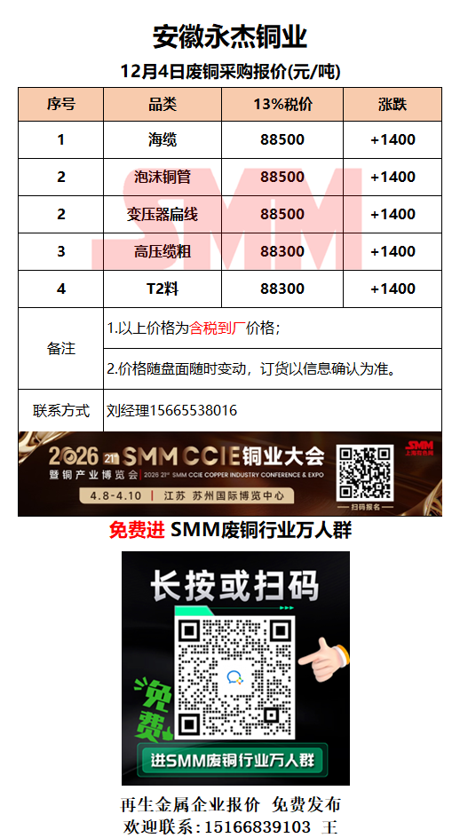 今日安徽永杰 废铜采购报价已更新,有货的朋友欢迎联系我们!